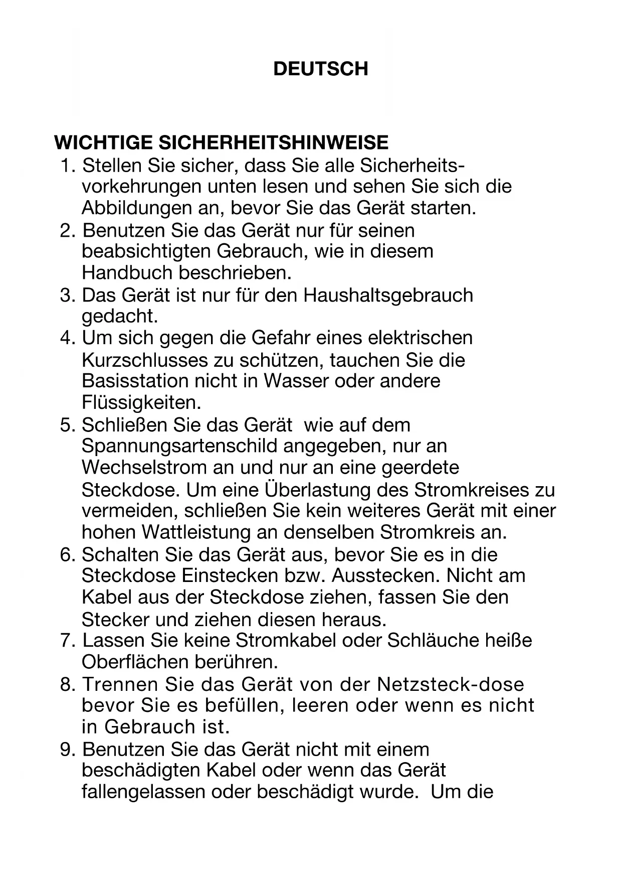 beschädigten Kabel oder wenn das Gerät fallengelassen oder beschädigt wurde. Um dieGefahr eines Strom-schlages zu vermeiden, zerlegen Sie das Gerät nicht. Bringen Sie das Gerät zu einem qualifizierten Techniker oder dessen Kundendienst um es zu prüfen und reparieren zu lassen. Falsche Montage kann bei der Benutzung zu einem Stromschlag führen. 10.Stellen Sie das Bügeleisen außerhalb der Reichweite von Kindern; Strenge Aufsicht ist notwendig für jedes Gerät das in der Nähe von Kindern benutzt wird. Lassen Sie das Eisen nicht unbeaufsichtigt an das Stromnetz angeschlossen. 11.Während der Benutzung platzieren Sie seinen Ständer immer auf einer stabilen, ebenen und waagerechten Fläche oder einem Bügelbrett. 12.Stellen Sie das Bügeleisen immer auf den Ständer und erlauben Sie der heißen Platte des Bügeleisens nicht das Netzkabel oder die Schläuche zu berühren. 13.Verbrennungen können durch das Berühren heißer Metallteile, heißem Wasser oder Dampf auftreten. Seien Sie vorsichtig, wenn Sie das Gerät benutzen. 14.Verwenden Sie niemals das Eisen zugewandten Menschen, da der Dampf Verbrennungen verursachen kann.