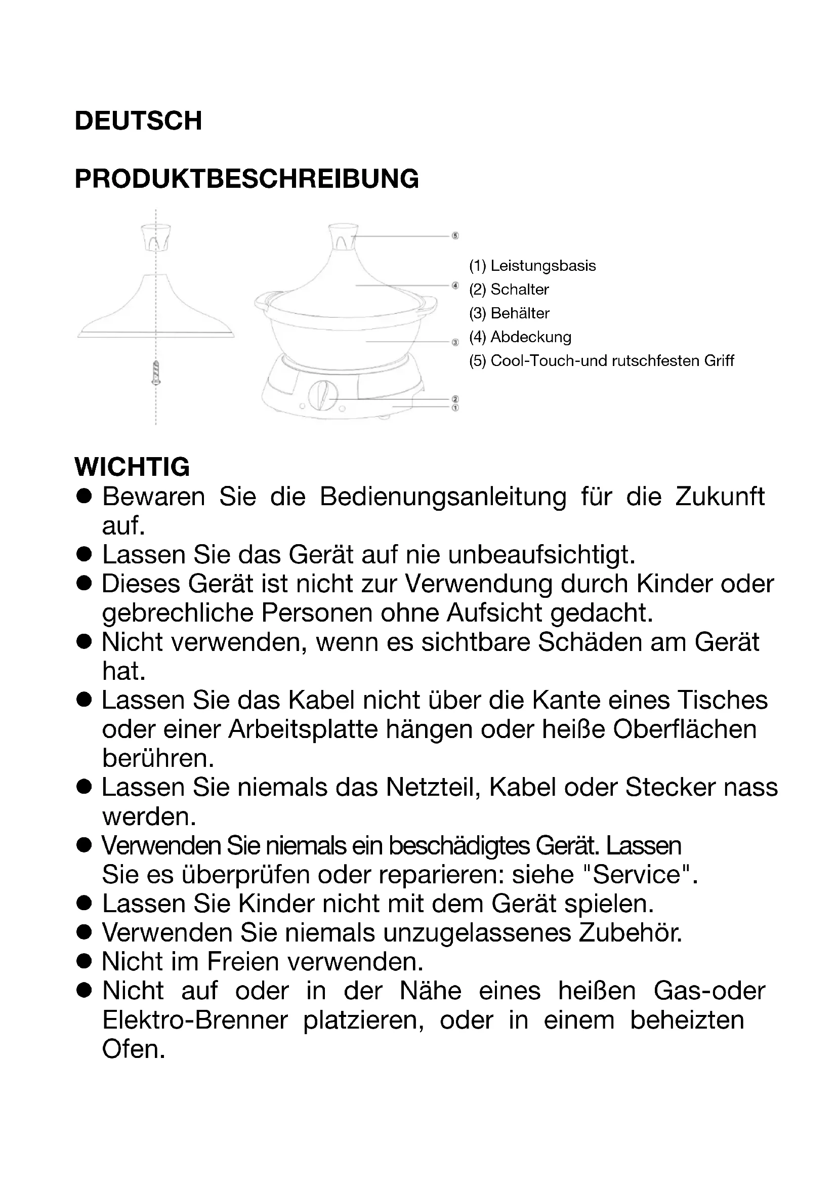 WICHTIG l Bewaren Sie die Bedienungsanleitung für die Zukunft auf. l Lassen Sie das Gerät auf nie unbeaufsichtigt. l Dieses Gerät ist nicht zur Verwendung durch Kinder oder gebrechliche Personen ohne Aufsicht gedacht. l Nicht verwenden, wenn es sichtbare Schäden am Gerät hat. l Lassen Sie das Kabel nicht über die Kante eines Tisches oder einer Arbeitsplatte hängen oder heiße Oberflächen berühren. l Lassen Sie niemals das Netzteil, Kabel oder Stecker nass werden. l Verwenden Sie niemals ein beschädigtes Gerät. Lassen Sie es überprüfen oder reparieren: siehe "Service". l Lassen Sie Kinder nicht mit dem Gerät spielen. l Verwenden Sie niemals unzugelassenes Zubehör. l Nicht im Freien verwenden. l Nicht auf oder in der Nähe eines heißen Gas-oder Elektro-Brenner platzieren, oder in einem beheizten Ofen.l Wenn der Behälter heiß ist, darf kein kaltes Wasser hinein. l Nicht Erhitzen des Behälters direkt auf das Feuer. l Dieses Gerät kann von Personen mit eingeschränkten körperlichen, sensorischen oder geistigen Fähigkeiten oder mangelnder Erfahrung und Kenntnis benutzt werden, vorausgesetzt, dass sie beaufsichtigt oder in der sicheren Benutzung des Gerätes unterwiesen werden und die möglichen Gefahren vollständig verstehen. l Kinder sollten beaufsichtigt werden, um sicherzustellen, dass sie nicht mit dem Gerät spielen. l Das Gerät darf nicht benutzt werden, wenn es fallen gelassen wurde,wenn auffällige Zeichen von Beschädigungen sichtbar sind oder wenn es undicht ist l Bedienen Sie das Gerät nicht, wenn das Kabel oder der Stecker beschädigt ist, wenn es nicht richtig funktioniert, heruntergefallen ist oder anderweitig beschädigt wurde. Wenn das Stromkabel in jeglicher Weise beschädigt ist, darf es nur vom Hersteller, einer von ihm beauftragen Werkstatt oder einer ähnlich qualifizierten Person ersetzt werden, um Gefährdungen zu vermeiden. l Dieses Gerät darf von Kindern ab 8 Jahren benutzt werden, sofern sie beaufsichtigt werden oder in die sichere Verwendung des Gerätes eingewiesen wurden und die damit verbundenen Gefahren verstehen. l Reinigung und Benutzerwartung dürfen nicht von Kindern durchgeführt werden, es sei denn, sie sind über 8 Jahre alt und werden von Erwachsenen beaufsichtigt. l Bewahren Sie das Gerät und sein Kabel außerhalb der Reichweite von Kindern unter 8 Jahren auf. l Bei der Verwendung elektrischer Geräte sollten immer Sicherheitsvorkehrungen getroffen werden, um die Gefahr von Feuer, Stromschlag und / oder Verletzungendurch unsachgemäßen Gebrauch zu vermeiden. l Prüfen Sie, ob die auf dem Typenschild des Gerätes angegebene Spannung mit der Ihrer Elektroinstallation übereinstimmt. Wenn nicht, wenden Sie sich an den Händler und schließen Sie das Gerät nicht an. l Lassen Sie das Gerät während des Gebrauchs niemals unbeaufsichtigt. l Öffnen Sie das Gerät nie von vorne, stellen Sie sich immer leicht seitlich, um sich nicht am Dampf zu verbrennen. l Bitte halten Sie dieses Dokument bereit und geben Sie es bei einer Weitergabe Ihres Gerätes an den zukünftigen Besitzer weiter. l Ihr Gerät ist nur für den Hausgebrauch bestimmt. Es wurde nicht für die Verwendung in den folgenden Fällen entwickelt, die nicht von der Garantie abgedeckt sind: - in Küchenbereichen, die dem Personal in Geschäften, Büros und anderen beruflichen Umgebungen vorbehalten sind, - in Bauerngasthöfen, - von Kunden von Hotels, Motels und anderen Wohnumgebungen, - in Umgebungen vom Typ Bed & Breakfast.BEVOR SIE ZUM ERSTEN MAL BENUTZEN