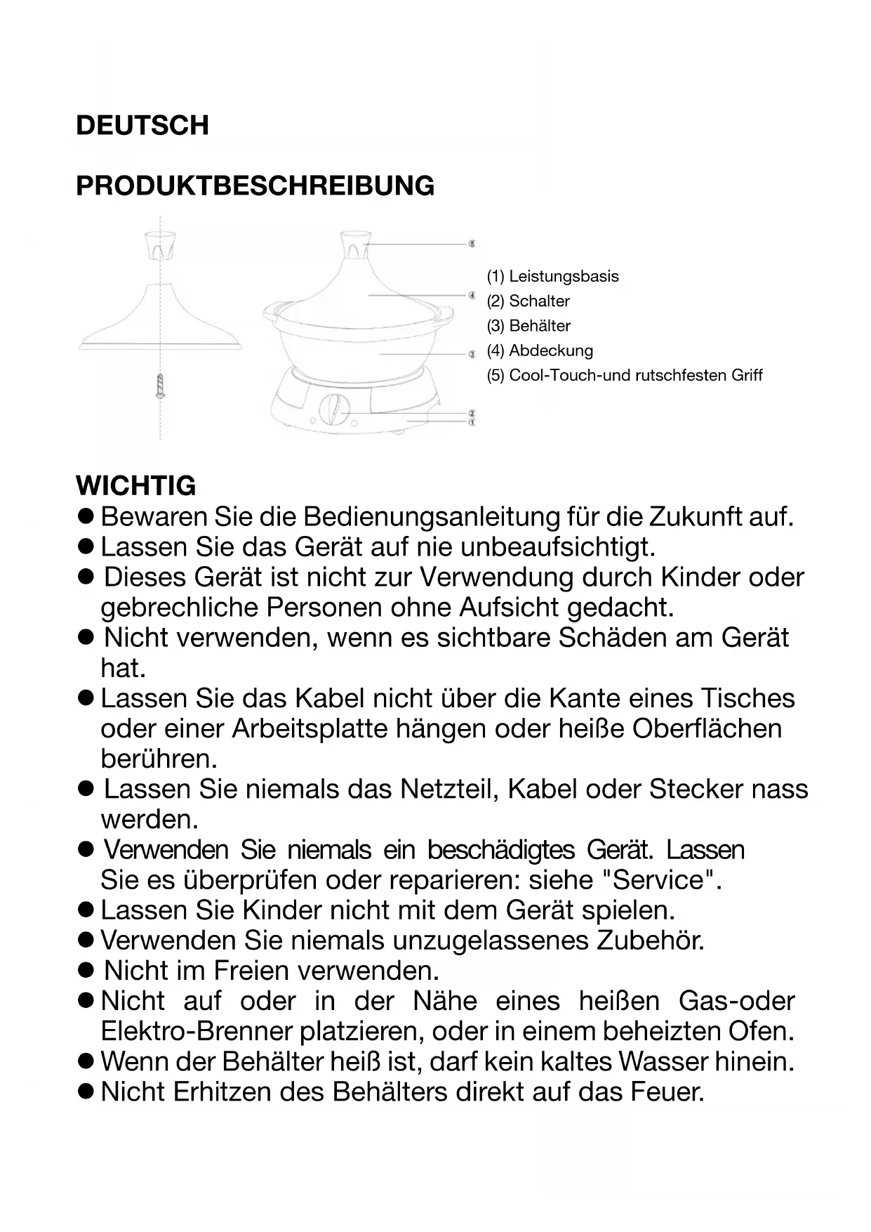 (1) Leistungsbasis (2) Schalter (3) Behälter (4) Abdeckung (5) Cool-Touch-und rutschfesten Griff