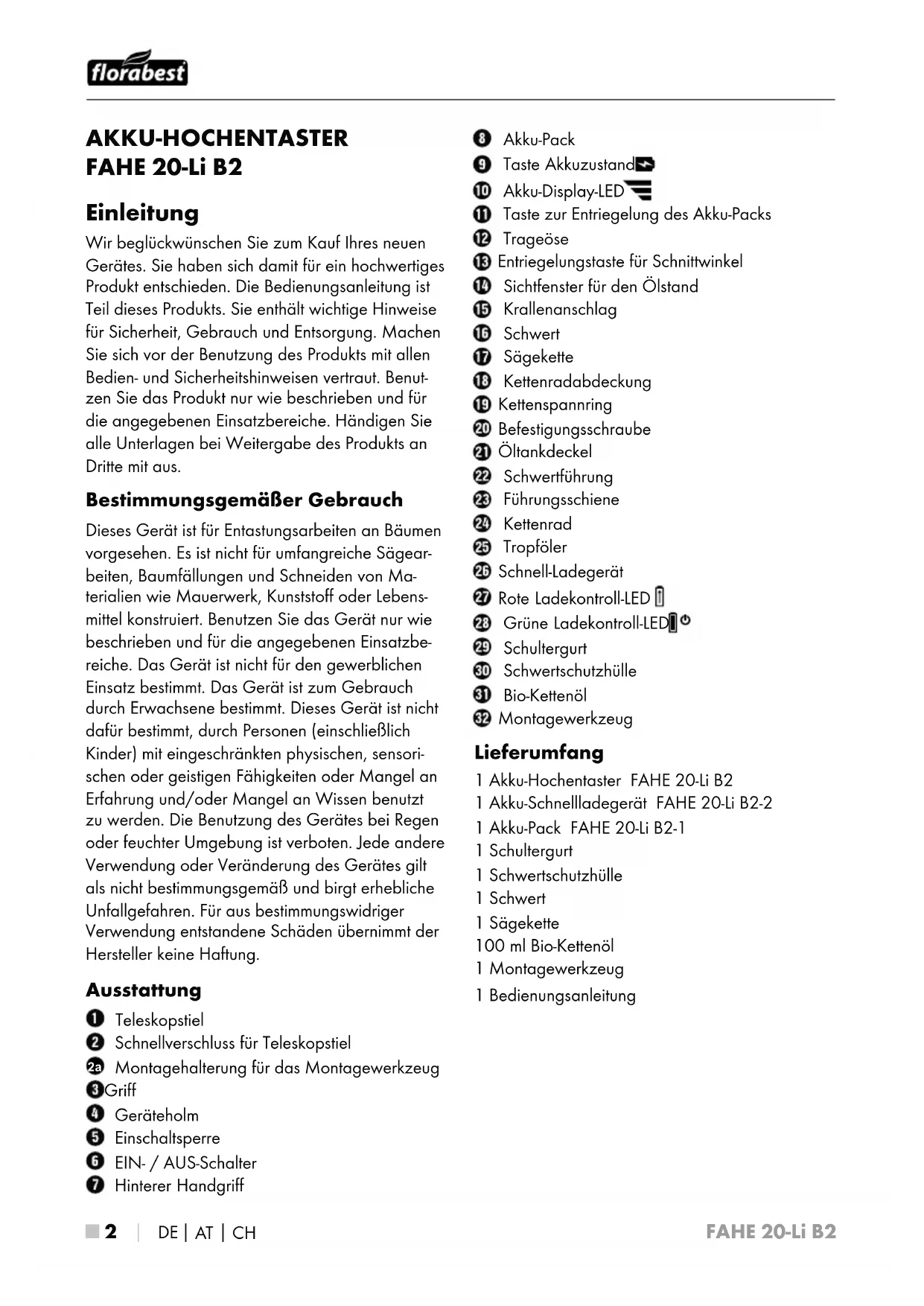 Montagehalterung für das Montagewerkzeug Griff Geräteholm Einschaltsperre EIN- / AUS-Schalter Hinterer Handgriff Akku-Pack Taste Akkuzustand Akku-Display-LED Taste zur Entriegelung des Akku-Packs Trageöse Entriegelungstaste für Schnittwinkel Sichtfenster für den Ölstand Krallenanschlag Schwert Sägekette Kettenradabdeckung Kettenspannring Befestigungsschraube Öltankdeckel Schwertführung Führungsschiene Kettenrad Tropföler Schnell-Ladegerät Rote Ladekontroll-LED Grüne Ladekontroll-LED Schultergurt Schwertschutzhülle Bio-Kettenöl Montagewerkzeug Lieferumfang 1 Akku-Hochentaster FAHE 20-Li B2 1 Akku-Schnellladegerät FAHE 20-Li B2-2 1 Akku-Pack FAHE 20-Li B2-1 1 Schultergurt 1 Schwertschutzhülle 1 Schwert 1 Sägekette 100 ml Bio-Kettenöl 1 Montagewerkzeug 1 BedienungsanleitungFAHE 20-Li B2