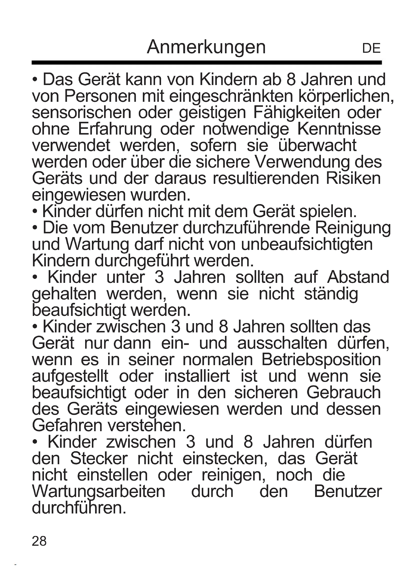 - Kinder zwischen 3 und 8 Jahren dürfen den Stecker nicht einstecken, das Gerät nicht einstellen oder reinigen, noch die Wartungsarbeiten durch den Benutzer durchführen. Anmerkungen DE29