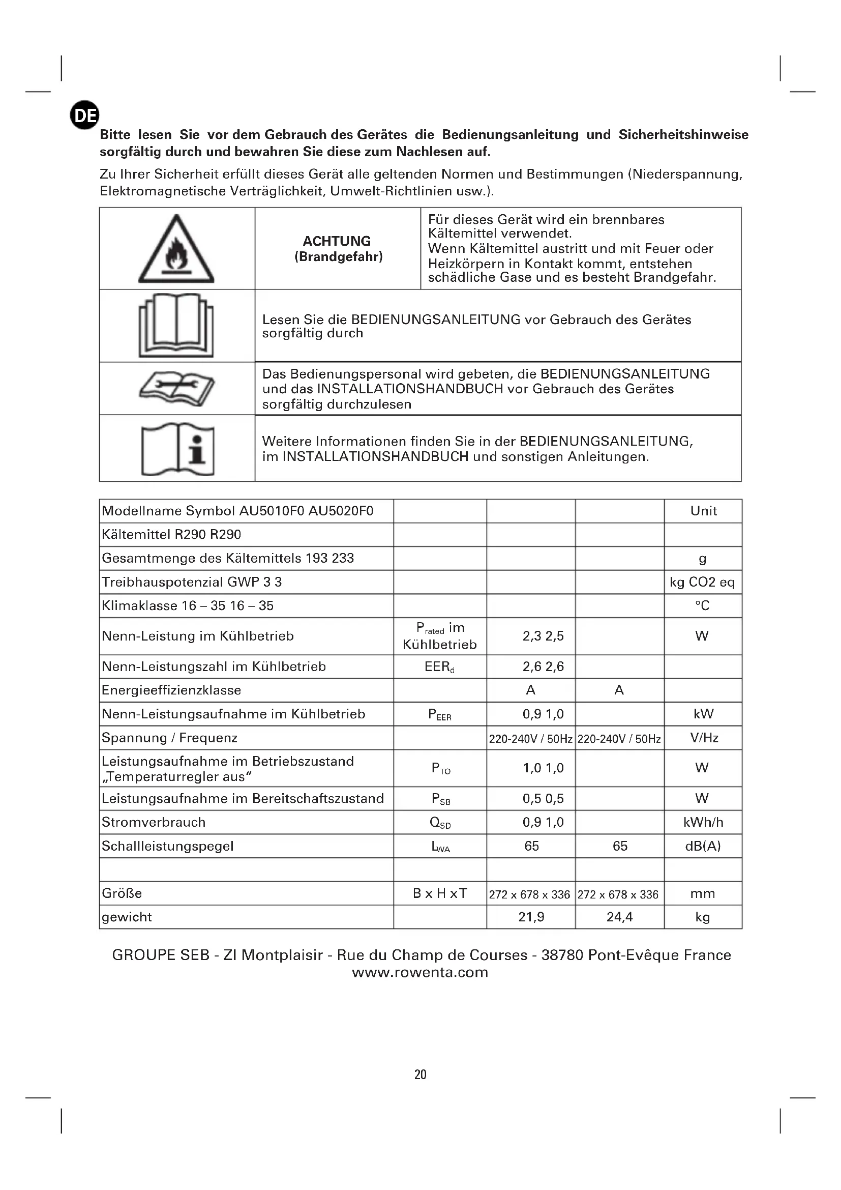 Bitte lesen Sie vor dem Gebrauch des Gerätes die Bedienungsanleitung und Sicherheitshinweise sorgfältig durch und bewahren Sie diese zum Nachlesen auf. Zu Ihrer Sicherheit erfüllt dieses Gerät alle geltenden Normen und Bestimmungen (Niederspannung, Elektromagnetische Verträglichkeit, Umwelt-Richtlinien usw.). ACHTUNG (Brandgefahr) Für dieses Gerät wird ein brennbares Kältemittel verwendet. Wenn Kältemittel austritt und mit Feuer oder Heizkörpern in Kontakt kommt, entstehen schädliche Gase und es besteht Brandgefahr. Lesen Sie die BEDIENUNGSANLEITUNG vor Gebrauch des Gerätes sorgfältig durch Das Bedienungspersonal wird gebeten, die BEDIENUNGSANLEITUNG und das INSTALLATIONSHANDBUCH vor Gebrauch des Gerätes sorgfältig durchzulesen Weitere Informationen finden Sie in der BEDIENUNGSANLEITUNG, im INSTALLATIONSHANDBUCH und sonstigen Anleitungen. Modellname Symbol AU5010F0 AU5020F0 Unit Kältemittel R290 R290 Gesamtmenge des Kältemittels 193 233