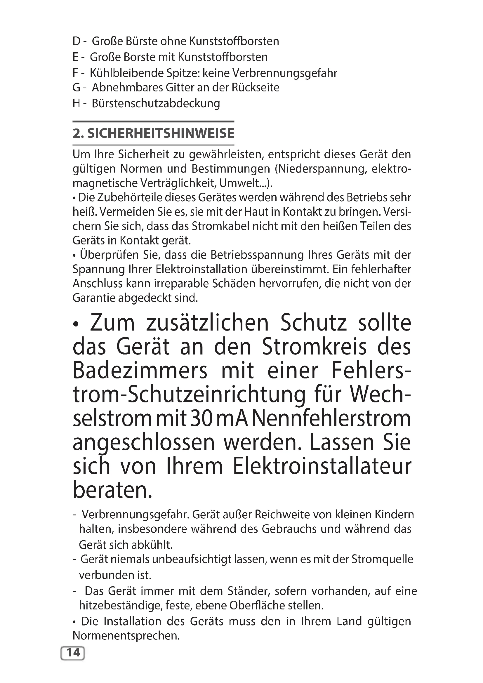 - Zum zusätzlichen Schutz sollte das Gerät an den Stromkreis des Badezimmers mit einer Fehlers- trom-Schutzeinrichtung für Wech- selstrom mit 30 mA Nennfehlerstrom angeschlossen werden. Lassen Sie sich von Ihrem Elektroinstallateur beraten. - Verbrennungsgefahr. Gerät außer Reichweite von kleinen Kindern halten, insbesondere während des Gebrauchs und während das Gerät sich abkühlt. - Gerät niemals unbeaufsichtigt lassen, wenn es mit der Stromquelle verbunden ist. - Das Gerät immer mit dem Ständer, sofern vorhanden, auf eine hitzebeständige, feste, ebene Oberäche stellen.