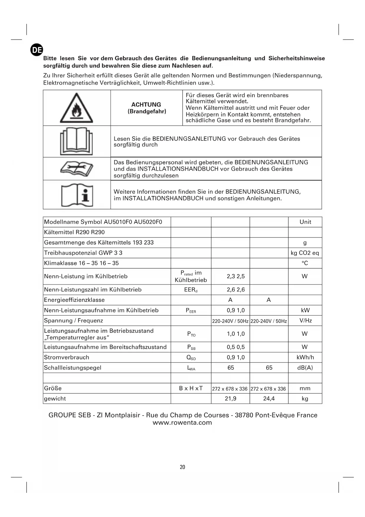 Bitte lesen Sie vor dem Gebrauch des Gerätes die Bedienungsanleitung und Sicherheitshinweise sorgfältig durch und bewahren Sie diese zum Nachlesen auf. Zu Ihrer Sicherheit erfüllt dieses Gerät alle geltenden Normen und Bestimmungen (Niederspannung, Elektromagnetische Verträglichkeit, Umwelt-Richtlinien usw.). ACHTUNG (Brandgefahr) Für dieses Gerät wird ein brennbares Kältemittel verwendet. Wenn Kältemittel austritt und mit Feuer oder Heizkörpern in Kontakt kommt, entstehen schädliche Gase und es besteht Brandgefahr. Lesen Sie die BEDIENUNGSANLEITUNG vor Gebrauch des Gerätes sorgfältig durch Das Bedienungspersonal wird gebeten, die BEDIENUNGSANLEITUNG und das INSTALLATIONSHANDBUCH vor Gebrauch des Gerätes sorgfältig durchzulesen Weitere Informationen finden Sie in der BEDIENUNGSANLEITUNG, im INSTALLATIONSHANDBUCH und sonstigen Anleitungen. Modellname Symbol AU5010F0 AU5020F0 Unit Kältemittel R290 R290 Gesamtmenge des Kältemittels 193 233