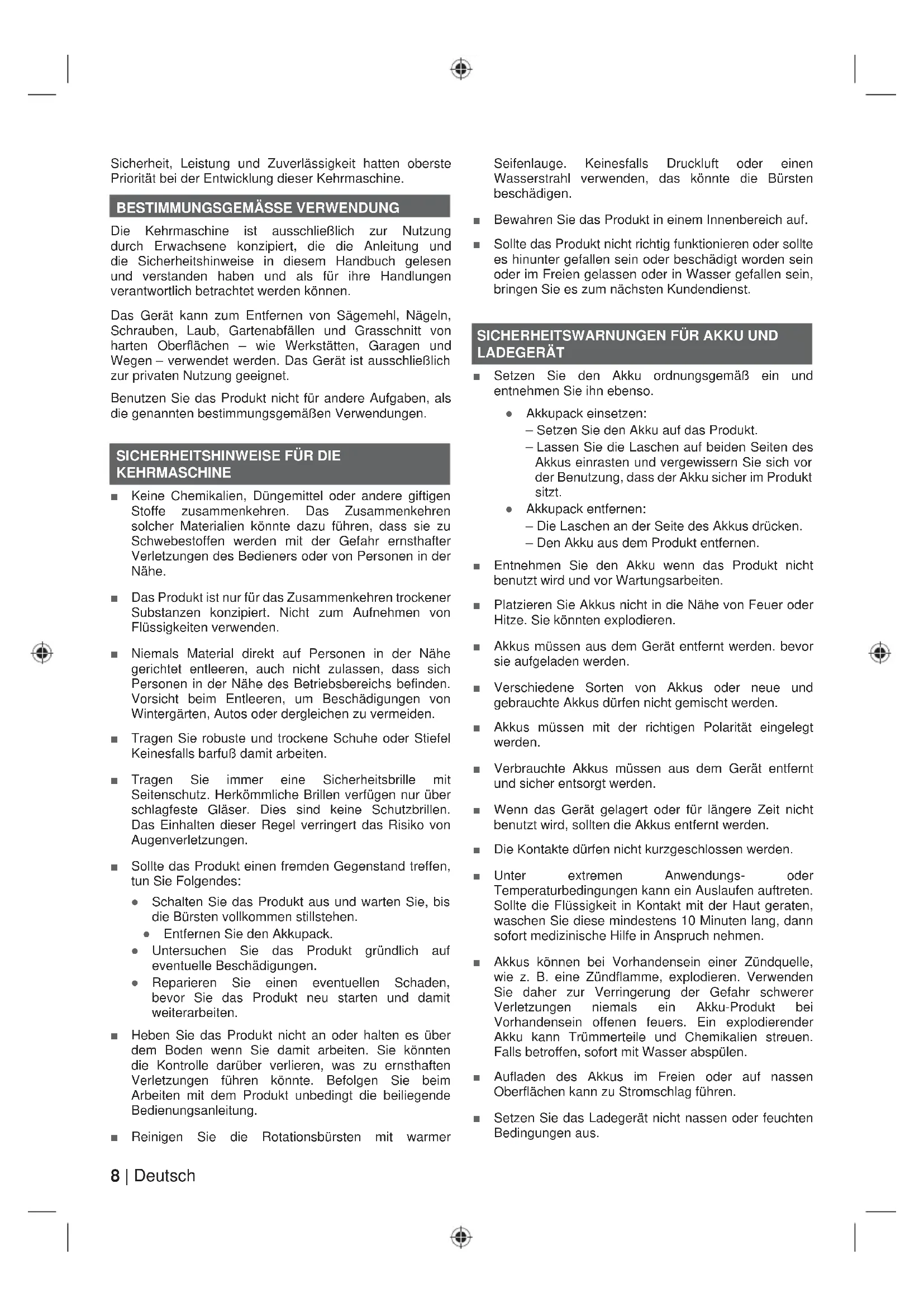 KEHRMASCHINE Ŷ Keine Chemikalien, Düngemittel oder andere giftigen Stoffe zusammenkehren. Das Zusammenkehren solcher Materialien könnte dazu führen, dass sie zu Schwebestoffen werden mit der Gefahr ernsthafter Verletzungen des Bedieners oder von Personen in der Nähe. Ŷ Das Produkt ist nur für das Zusammenkehren trockener Substanzen konzipiert. Nicht zum Aufnehmen von Flüssigkeiten verwenden. Ŷ Niemals Material direkt auf Personen in der Nähe gerichtet entleeren, auch nicht zulassen, dass sich Personen in der Nähe des Betriebsbereichs befinden. Vorsicht beim Entleeren, um Beschädigungen von Wintergärten, Autos oder dergleichen zu vermeiden. Ŷ Tragen Sie robuste und trockene Schuhe oder Stiefel Keinesfalls barfuß damit arbeiten. Ŷ Tragen Sie immer eine Sicherheitsbrille mit Seitenschutz. Herkömmliche Brillen verfügen nur über schlagfeste Gläser. Dies sind keine Schutzbrillen. Das Einhalten dieser Regel verringert das Risiko von Augenverletzungen. Ŷ Sollte das Produkt einen fremden Gegenstand treffen, tun Sie Folgendes: Ɣ Schalten Sie das Produkt aus und warten Sie, bis die Bürsten vollkommen stillstehen. Ɣ Entfernen Sie den Akkupack. Ɣ Untersuchen Sie das Produkt gründlich auf eventuelle Beschädigungen. Ɣ Reparieren Sie einen eventuellen Schaden, bevor Sie das Produkt neu starten und damit weiterarbeiten. Ŷ Heben Sie das Produkt nicht an oder halten es über dem Boden wenn Sie damit arbeiten. Sie könnten die Kontrolle darüber verlieren, was zu ernsthaften Verletzungen führen könnte. Befolgen Sie beim Arbeiten mit dem Produkt unbedingt die beiliegende Bedienungsanleitung. Ŷ Reinigen Sie die Rotationsbürsten mit warmer Seifenlauge. Keinesfalls Druckluft oder einen Wasserstrahl verwenden, das könnte die Bürsten beschädigen. Ŷ Bewahren Sie das Produkt in einem Innenbereich auf. Ŷ Sollte das Produkt nicht richtig funktionieren oder sollte es hinunter gefallen sein oder beschädigt worden sein oder im Freien gelassen oder in Wasser gefallen sein, bringen Sie es zum nächsten Kundendienst.