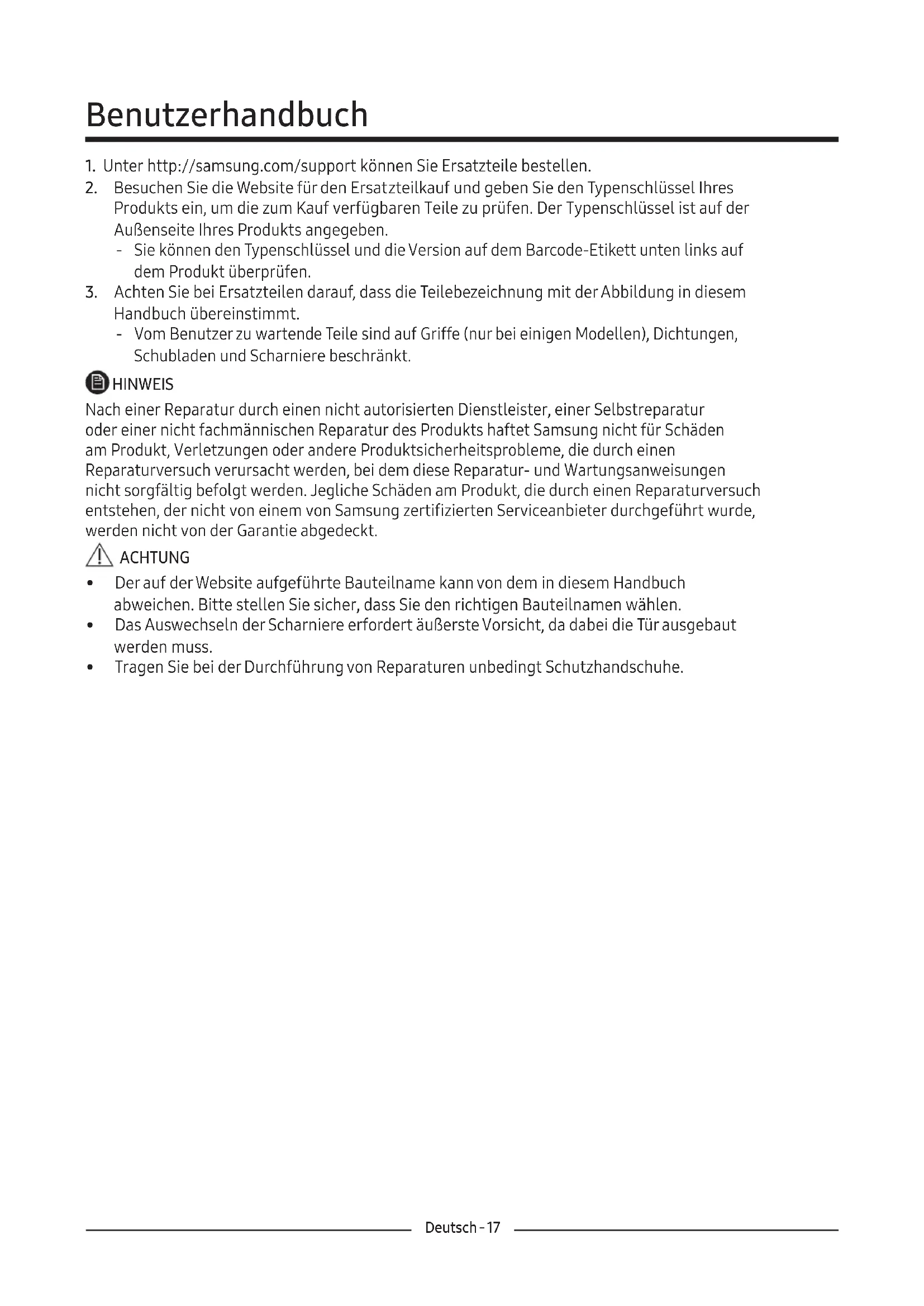 Handbuch übereinstimmt. ‐ Vom Benutzer zu wartende Teile sind auf Griffe (nur bei einigen Modellen), Dichtungen, Schubladen und Scharniere beschränkt. HINWEIS Nach einer Reparatur durch einen nicht autorisierten Dienstleister, einer Selbstreparatur oder einer nicht fachmännischen Reparatur des Produkts haftet Samsung nicht für Schäden am Produkt, Verletzungen oder andere Produktsicherheitsprobleme, die durch einen Reparaturversuch verursacht werden, bei dem diese Reparatur- und Wartungsanweisungen nicht sorgfältig befolgt werden. Jegliche Schäden am Produkt, die durch einen Reparaturversuch entstehen, der nicht von einem von Samsung zertifizierten Serviceanbieter durchgeführt wurde, werden nicht von der Garantie abgedeckt. ACHTUNG
