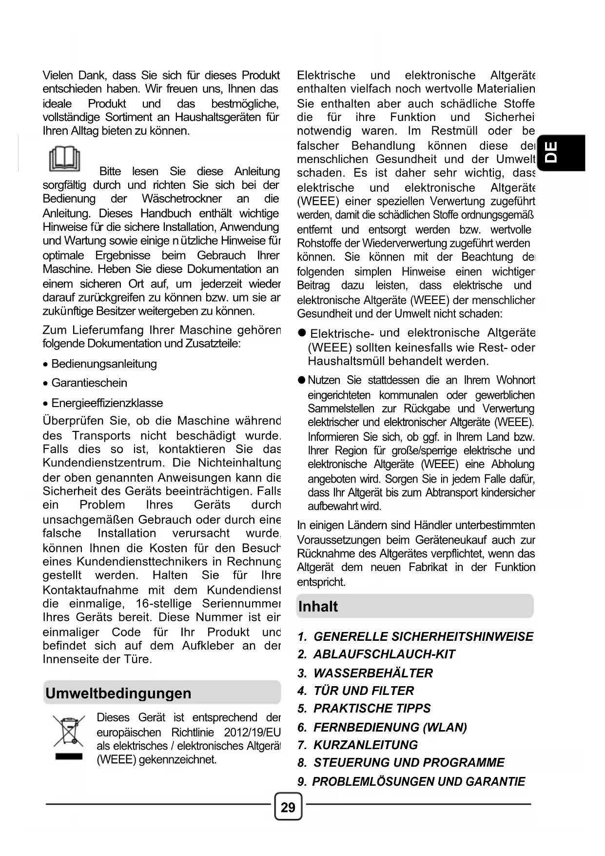 Diese Maschine dient als Haushaltsgerät ausschließlich zum Trocknen von Haushaltstextilien und Kleidungsstücken. Prüfen Sie vor dem Betrieb des Geräts, ob die Installations- und Gebrauchsanleitung richtig verstanden und beachtet wurde.