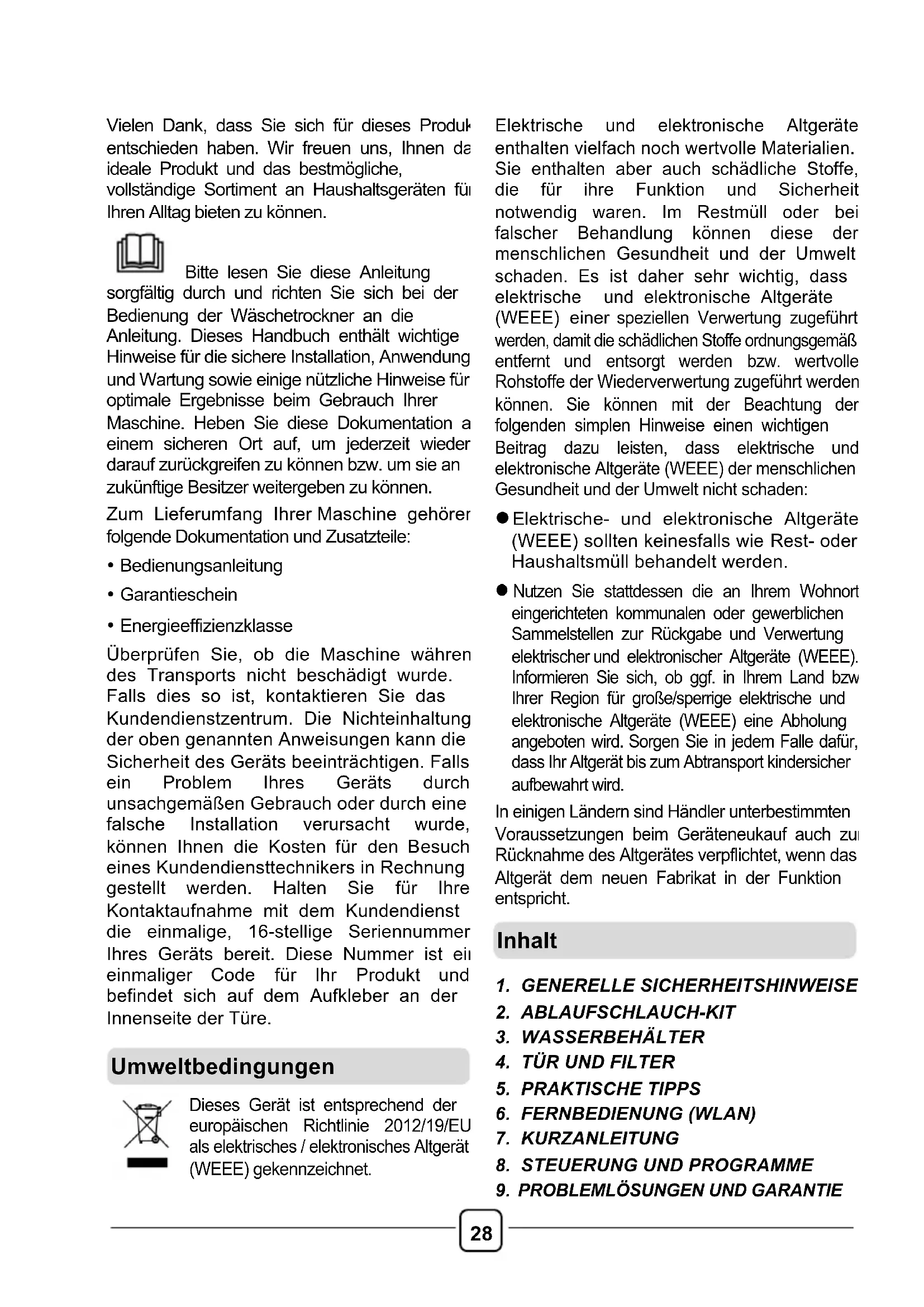 Vielen Dank, dass Sie sich für dieses Produkt entschieden haben. Wir freuen uns, Ihnen das ideale Produkt und das bestmögliche, vollständige Sortiment an Haushaltsgeräten für Ihren Alltag bieten zu können. Bitte lesen Sie diese Anleitung sorgfältig durch und richten Sie sich bei der Bedienung der Wäschetrockner an die Anleitung. Dieses Handbuch enthält wichtige Hinweise für die sichere Installation, Anwendung und Wartung sowie einige nützliche Hinweise für optimale Ergebnisse beim Gebrauch Ihrer Maschine. Heben Sie diese Dokumentation an einem sicheren Ort auf, um jederzeit wieder darauf zurückgreifen zu können bzw. um sie an zukünftige Besitzer weitergeben zu können. Zum Lieferumfang Ihrer Maschine gehören folgende Dokumentation und Zusatzteile: