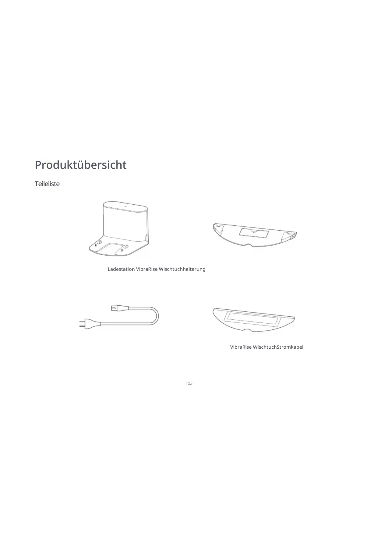 ZZZURERURFNFRPI¾U'HWDLOV Roboter System-Reset Entlüftung VibraRise Wischtuchhalterung Wassertank WLAN-Anzeige Staubbehälter Filter-Abdeckung Staubbehälter- Verschluss Waschbarer Filter Verschluss der Filter- Abdeckung Produktübersicht Lufteinlass Hinweis:105 Roboter und Sensoren Stations- Sucher Stoßfänger LiDAR-Sensor Vertikaler Stoßfänger Wassertank- Verschluss Klippensensoren Rundlaufendes Rad Wandsensor Ladekontakte Teppichsensor Seitenbürste Hauptrad Hauptbürste Verschluss der Hauptbürsten- Abdeckung Produktübersicht106 VibraRise-Modul Wassertank-Stopfen :DVVHUࢉOWHU Elektrischer Wassertank Wassertank-Verschluss Wischtuch-Befestigungsschlitz VibraRise Wischtuchhalterung VibraRise Wischtuch Befestigungsbereich Verriegelung der Wischtuchhalterung Vibrationsmodul Produktübersicht107 Ladestation Stations-Standortsignal Stromanzeige der Ladestation Ladekontakte Elektrodenbürsten Produktübersicht Stromanschluss Wichtig
