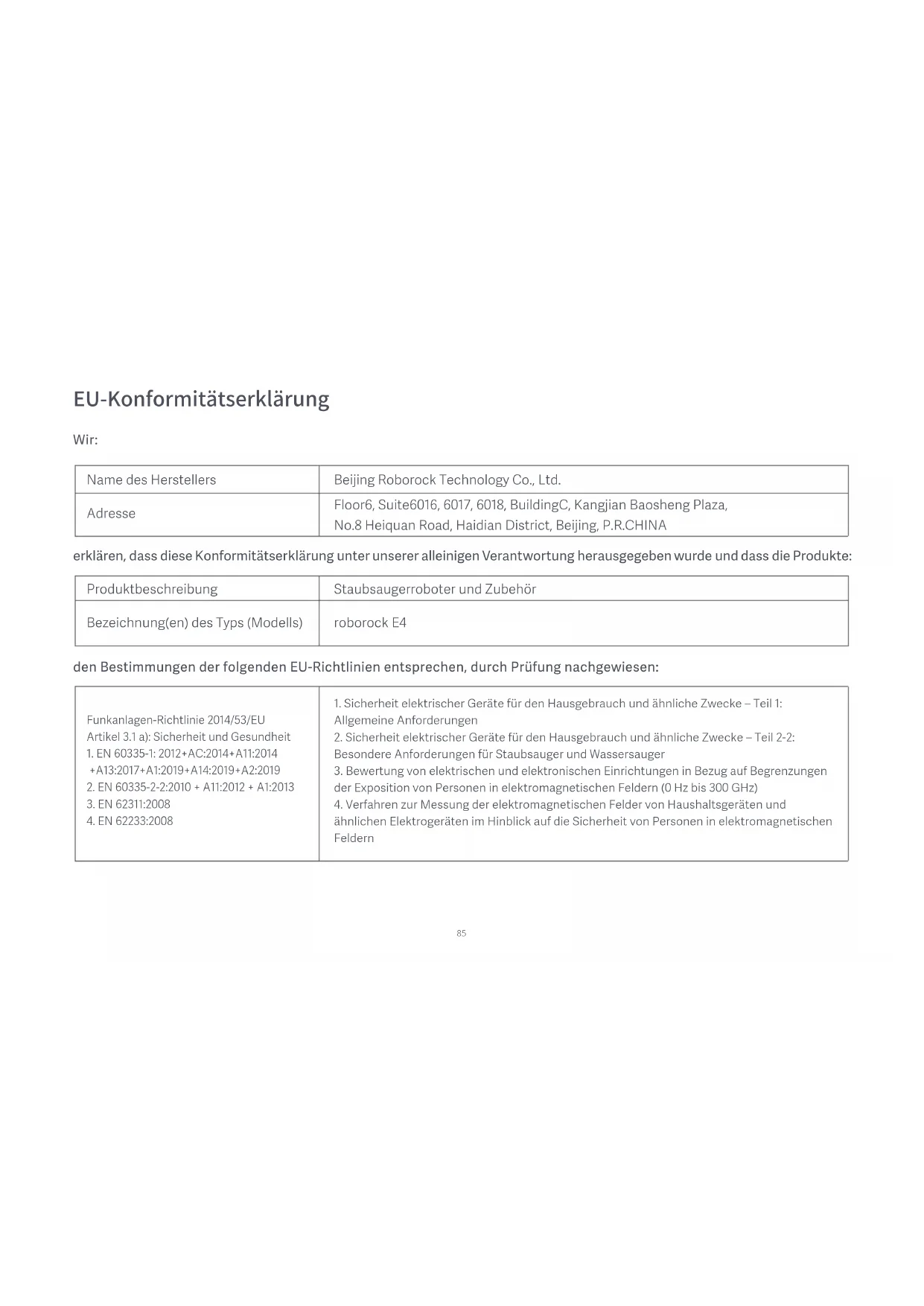 #JUUFQS»GFO4JFPCTJDI8BTTFSJN8BTTFSUBOLCFOEFUTQ»MFO4JFEBT8JTDIUVDIBVTFSTFU[FO4JFEFO'JMUFS PEFSCFGPMHFO4JFEJF"OXFJTVOHFOJN#FOVU[FSIBOECVDI[VS.POUBHFEFT8JTDIUVDIT ;VWJFM8BTTFSCFJN8JTDIFO #JUUFQS»GFO4JFPCEJF"CEFDLVOHEFT8BTTFSUBOLTVOEEFS'JMUFSPSEOVOHTHFN£JOTUBMMJFSUTJOE Wir: Name des Herstellers Adresse Beijing Roborock Technology Co., Ltd. Floor6, Suite6016, 6017, 6018, BuildingC, Kangjian Baosheng Plaza, No.8 Heiquan Road, Haidian District, Beijing, P.R.CHINA erklären, dass diese Konformitätserklärung unter unserer alleinigen Verantwortung herausgegeben wurde und dass die Produkte: Produktbeschreibung Bezeichnung(en) des Typs (Modells) Staubsaugerroboter und Zubehör roborock E4 den Bestimmungen der folgenden EU-Richtlinien entsprechen, durch Prüfung nachgewiesen: Funkanlagen-Richtlinie 2014/53/EU Artikel 3.1 a): Sicherheit und Gesundheit