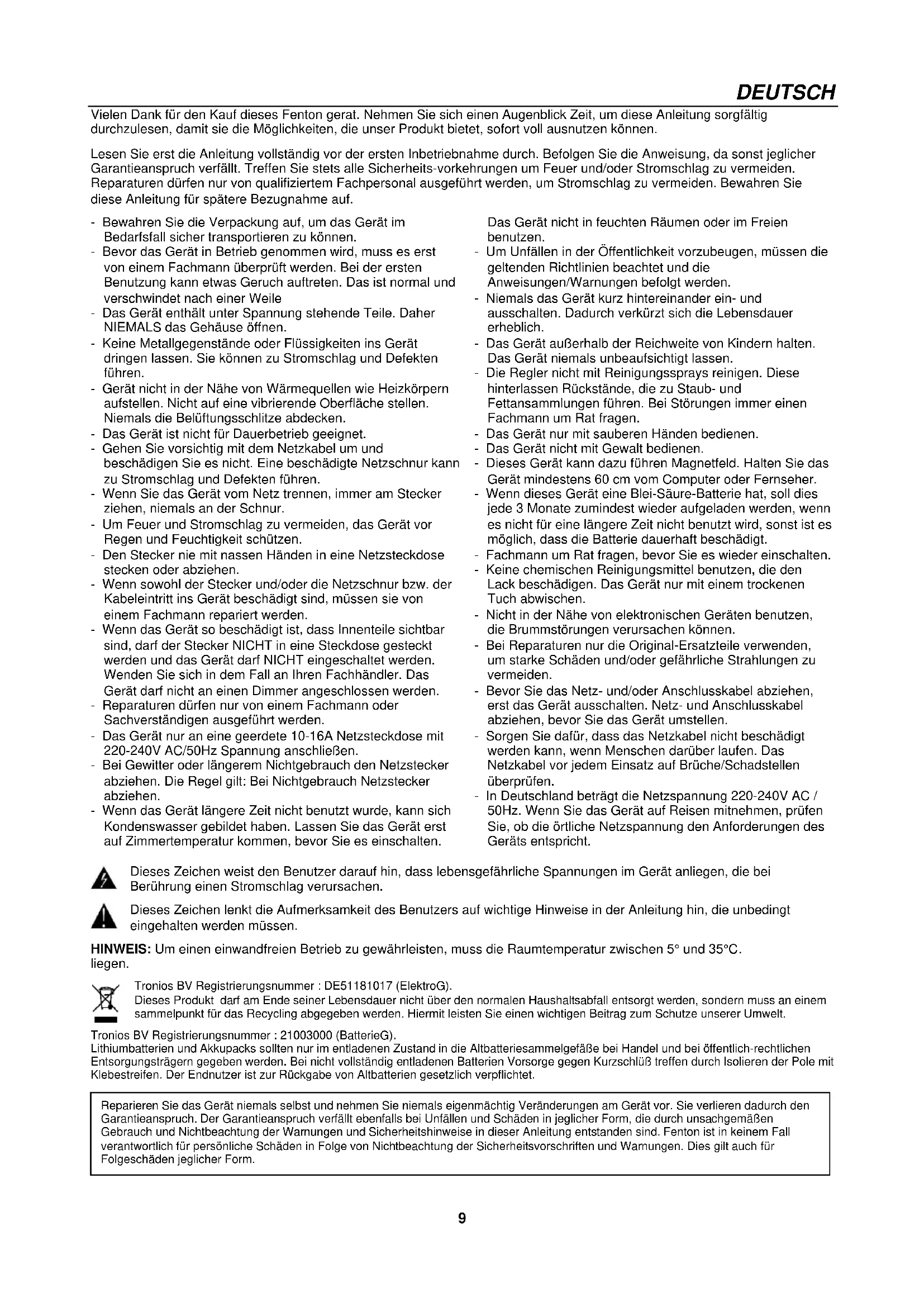 Voor het aansluiten van het netsnoer, controleer eerst of de netspanning overeenkomt met het typeplaatje van de unit.9 DEUTSCH Vielen Dank für den Kauf dieses Fenton gerat. Nehmen Sie sich einen Augenblick Zeit, um diese Anleitung sorgfältig durchzulesen, damit sie die Möglichkeiten, die unser Produkt bietet, sofort voll ausnutzen können. Lesen Sie erst die Anleitung vollständig vor der ersten Inbetriebnahme durch. Befolgen Sie die Anweisung, da sonst jeglicher Garantieanspruch verfällt. Treffen Sie stets alle Sicherheits-vorkehrungen um Feuer und/oder Stromschlag zu vermeiden. Reparaturen dürfen nur von qualifiziertem Fachpersonal ausgeführt werden, um Stromschlag zu vermeiden. Bewahren Sie diese Anleitung für spätere Bezugnahme auf. - Bewahren Sie die Verpackung auf, um das Gerät im Bedarfsfall sicher transportieren zu können. - Bevor das Gerät in Betrieb genommen wird, muss es erst von einem Fachmann überprüft werden. Bei der ersten Benutzung kann etwas Geruch auftreten. Das ist normal und verschwindet nach einer Weile - Das Gerät enthält unter Spannung stehende Teile. Daher NIEMALS das Gehäuse öffnen. - Keine Metallgegenstände oder Flüssigkeiten ins Gerät dringen lassen. Sie können zu Stromschlag und Defekten führen. - Gerät nicht in der Nähe von Wärmequellen wie Heizkörpern aufstellen. Nicht auf eine vibrierende Oberfläche stellen. Niemals die Belüftungsschlitze abdecken. - Das Gerät ist nicht für Dauerbetrieb geeignet. - Gehen Sie vorsichtig mit dem Netzkabel um und beschädigen Sie es nicht. Eine beschädigte Netzschnur kann zu Stromschlag und Defekten führen. - Wenn Sie das Gerät vom Netz trennen, immer am Stecker ziehen, niemals an der Schnur. - Um Feuer und Stromschlag zu vermeiden, das Gerät vor Regen und Feuchtigkeit schützen. - Den Stecker nie mit nassen Händen in eine Netzsteckdose stecken oder abziehen. - Wenn sowohl der Stecker und/oder die Netzschnur bzw. der Kabeleintritt ins Gerät beschädigt sind, müssen sie von einem Fachmann repariert werden. - Wenn das Gerät so beschädigt ist, dass Innenteile sichtbar sind, darf der Stecker NICHT in eine Steckdose gesteckt werden und das Gerät darf NICHT eingeschaltet werden. Wenden Sie sich in dem Fall an Ihren Fachhändler. Das Gerät darf nicht an einen Dimmer angeschlossen werden. - Reparaturen dürfen nur von einem Fachmann oder Sachverständigen ausgeführt werden. - Das Gerät nur an eine geerdete 10-16A Netzsteckdose mit 220-240V AC/50Hz Spannung anschließen. - Bei Gewitter oder längerem Nichtgebrauch den Netzstecker abziehen. Die Regel gilt: Bei Nichtgebrauch Netzstecker abziehen. - Wenn das Gerät längere Zeit nicht benutzt wurde, kann sich Kondenswasser gebildet haben. Lassen Sie das Gerät erst auf Zimmertemperatur kommen, bevor Sie es einschalten. Das Gerät nicht in feuchten Räumen oder im Freien benutzen. - Um Unfällen in der Öffentlichkeit vorzubeugen, müssen die geltenden Richtlinien beachtet und die Anweisungen/Warnungen befolgt werden. - Niemals das Gerät kurz hintereinander ein- und ausschalten. Dadurch verkürzt sich die Lebensdauer erheblich. - Das Gerät außerhalb der Reichweite von Kindern halten. Das Gerät niemals unbeaufsichtigt lassen. - Die Regler nicht mit Reinigungssprays reinigen. Diese hinterlassen Rückstände, die zu Staub- und Fettansammlungen führen. Bei Störungen immer einen Fachmann um Rat fragen. - Das Gerät nur mit sauberen Händen bedienen. - Das Gerät nicht mit Gewalt bedienen. - Dieses Gerät kann dazu führen Magnetfeld. Halten Sie das Gerät mindestens 60 cm vom Computer oder Fernseher. - Wenn dieses Gerät eine Blei-Säure-Batterie hat, soll dies jede 3 Monate zumindest wieder aufgeladen werden, wenn es nicht für eine längere Zeit nicht benutzt wird, sonst ist es möglich, dass die Batterie dauerhaft beschädigt. - Fachmann um Rat fragen, bevor Sie es wieder einschalten. - Keine chemischen Reinigungsmittel benutzen, die den Lack beschädigen. Das Gerät nur mit einem trockenen Tuch abwischen. - Nicht in der Nähe von elektronischen Geräten benutzen, die Brummstörungen verursachen können. - Bei Reparaturen nur die Original-Ersatzteile verwenden, um starke Schäden und/oder gefährliche Strahlungen zu vermeiden. - Bevor Sie das Netz- und/oder Anschlusskabel abziehen, erst das Gerät ausschalten. Netz- und Anschlusskabel abziehen, bevor Sie das Gerät umstellen. - Sorgen Sie dafür, dass das Netzkabel nicht beschädigt werden kann, wenn Menschen darüber laufen. Das Netzkabel vor jedem Einsatz auf Brüche/Schadstellen überprüfen. - In Deutschland beträgt die Netzspannung 220-240V AC / 50Hz. Wenn Sie das Gerät auf Reisen mitnehmen, prüfen Sie, ob die örtliche Netzspannung den Anforderungen des Geräts entspricht. Dieses Zeichen weist den Benutzer darauf hin, dass lebensgefährliche Spannungen im Gerät anliegen, die bei Berührung einen Stromschlag verursachen. Dieses Zeichen lenkt die Aufmerksamkeit des Benutzers auf wichtige Hinweise in der Anleitung hin, die unbedingt eingehalten werden müssen. HINWEIS: Um einen einwandfreien Betrieb zu gewährleisten, muss die Raumtemperatur zwischen 5° und 35°C. liegen. Tronios BV Registrierungsnummer : DE51181017 (ElektroG). Dieses Produkt darf am Ende seiner Lebensdauer nicht über den normalen Haushaltsabfall entsorgt werden, sondern muss an einem sammelpunkt für das Recycling abgegeben werden. Hiermit leisten Sie einen wichtigen Beitrag zum Schutze unserer Umwelt. Tronios BV Registrierungsnummer : 21003000 (BatterieG). Lithiumbatterien und Akkupacks sollten nur im entladenen Zustand in die Altbatteriesammelgefäße bei Handel und bei öffentlich-rechtlichen Entsorgungsträgern gegeben werden. Bei nicht vollständig entladenen Batterien Vorsorge gegen Kurzschlüß treffen durch Isolieren der Pole mit Klebestreifen. Der Endnutzer ist zur Rückgabe von Altbatterien gesetzlich verpflichtet.