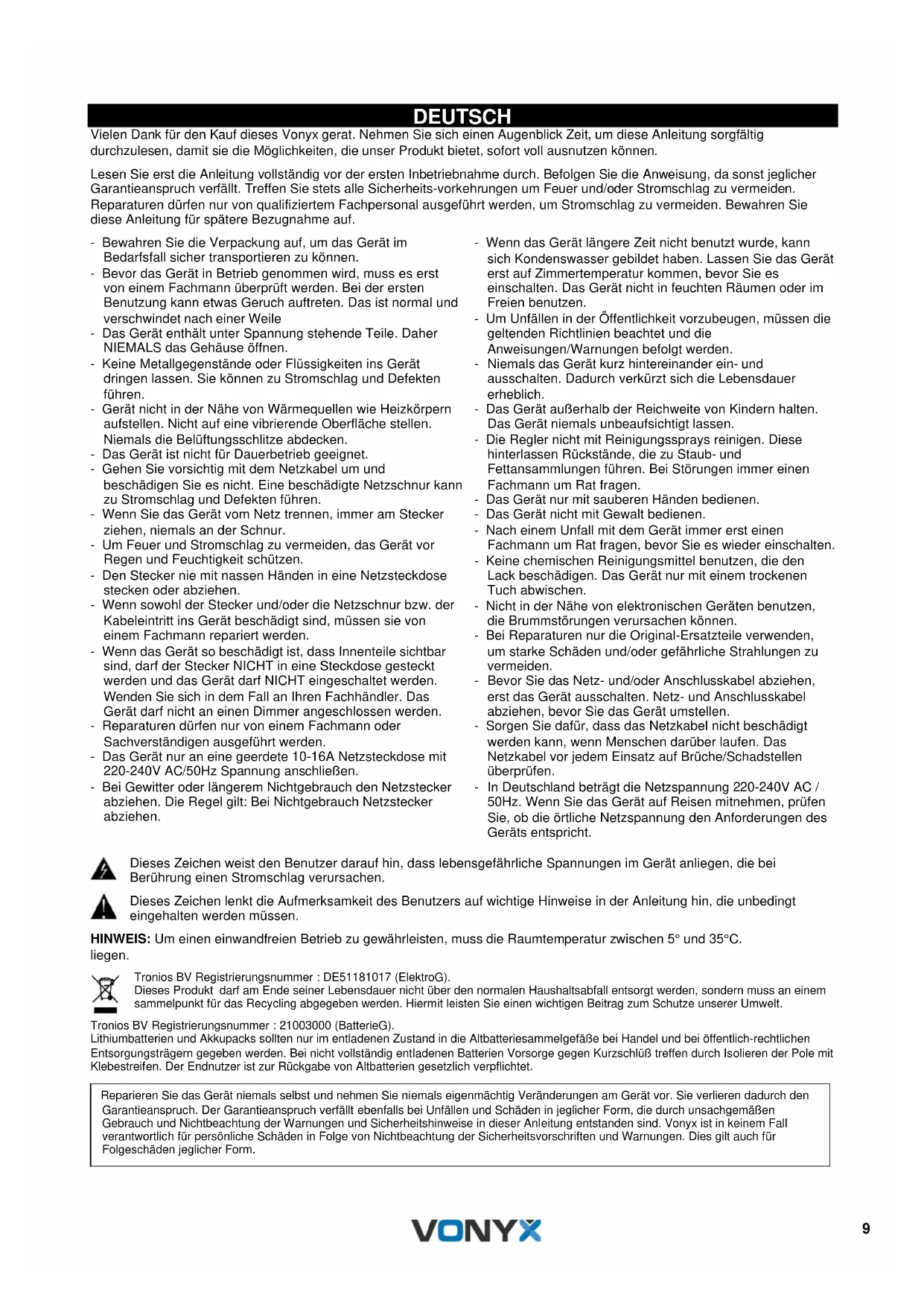 DEUTSCH Vielen Dank für den Kauf dieses Vonyx gerat. Nehmen Sie sich einen Augenblick Zeit, um diese Anleitung sorgfältig durchzulesen, damit sie die Möglichkeiten, die unser Produkt bietet, sofort voll ausnutzen können. Lesen Sie erst die Anleitung vollständig vor der ersten Inbetriebnahme durch. Befolgen Sie die Anweisung, da sonst jeglicher Garantieanspruch verfällt. Treffen Sie stets alle Sicherheits-vorkehrungen um Feuer und/oder Stromschlag zu vermeiden. Reparaturen dürfen nur von qualifiziertem Fachpersonal ausgeführt werden, um Stromschlag zu vermeiden. Bewahren Sie diese Anleitung für spätere Bezugnahme auf. - Bewahren Sie die Verpackung auf, um das Gerät im Bedarfsfall sicher transportieren zu können. - Bevor das Gerät in Betrieb genommen wird, muss es erst von einem Fachmann überprüft werden. Bei der ersten Benutzung kann etwas Geruch auftreten. Das ist normal und verschwindet nach einer Weile - Das Gerät enthält unter Spannung stehende Teile. Daher NIEMALS das Gehäuse öffnen. - Keine Metallgegenstände oder Flüssigkeiten ins Gerät dringen lassen. Sie können zu Stromschlag und Defekten führen. - Gerät nicht in der Nähe von Wärmequellen wie Heizkörpern aufstellen. Nicht auf eine vibrierende Oberfläche stellen. Niemals die Belüftungsschlitze abdecken. - Das Gerät ist nicht für Dauerbetrieb geeignet. - Gehen Sie vorsichtig mit dem Netzkabel um und beschädigen Sie es nicht. Eine beschädigte Netzschnur kann zu Stromschlag und Defekten führen. - Wenn Sie das Gerät vom Netz trennen, immer am Stecker ziehen, niemals an der Schnur. - Um Feuer und Stromschlag zu vermeiden, das Gerät vor Regen und Feuchtigkeit schützen. - Den Stecker nie mit nassen Händen in eine Netzsteckdose stecken oder abziehen. - Wenn sowohl der Stecker und/oder die Netzschnur bzw. der Kabeleintritt ins Gerät beschädigt sind, müssen sie von einem Fachmann repariert werden. - Wenn das Gerät so beschädigt ist, dass Innenteile sichtbar sind, darf der Stecker NICHT in eine Steckdose gesteckt werden und das Gerät darf NICHT eingeschaltet werden. Wenden Sie sich in dem Fall an Ihren Fachhändler. Das Gerät darf nicht an einen Dimmer angeschlossen werden. - Reparaturen dürfen nur von einem Fachmann oder Sachverständigen ausgeführt werden. - Das Gerät nur an eine geerdete 10-16A Netzsteckdose mit 220-240V AC/50Hz Spannung anschließen. - Bei Gewitter oder längerem Nichtgebrauch den Netzstecker abziehen. Die Regel gilt: Bei Nichtgebrauch Netzstecker abziehen. - Wenn das Gerät längere Zeit nicht benutzt wurde, kann sich Kondenswasser gebildet haben. Lassen Sie das Gerät erst auf Zimmertemperatur kommen, bevor Sie es einschalten. Das Gerät nicht in feuchten Räumen oder im Freien benutzen. - Um Unfällen in der Öffentlichkeit vorzubeugen, müssen die geltenden Richtlinien beachtet und die Anweisungen/Warnungen befolgt werden. - Niemals das Gerät kurz hintereinander ein- und ausschalten. Dadurch verkürzt sich die Lebensdauer erheblich. - Das Gerät außerhalb der Reichweite von Kindern halten. Das Gerät niemals unbeaufsichtigt lassen. - Die Regler nicht mit Reinigungssprays reinigen. Diese hinterlassen Rückstände, die zu Staub- und Fettansammlungen führen. Bei Störungen immer einen Fachmann um Rat fragen. - Das Gerät nur mit sauberen Händen bedienen. - Das Gerät nicht mit Gewalt bedienen. - Nach einem Unfall mit dem Gerät immer erst einen Fachmann um Rat fragen, bevor Sie es wieder einschalten. - Keine chemischen Reinigungsmittel benutzen, die den Lack beschädigen. Das Gerät nur mit einem trockenen Tuch abwischen. - Nicht in der Nähe von elektronischen Geräten benutzen, die Brummstörungen verursachen können. - Bei Reparaturen nur die Original-Ersatzteile verwenden, um starke Schäden und/oder gefährliche Strahlungen zu vermeiden. - Bevor Sie das Netz- und/oder Anschlusskabel abziehen, erst das Gerät ausschalten. Netz- und Anschlusskabel abziehen, bevor Sie das Gerät umstellen. - Sorgen Sie dafür, dass das Netzkabel nicht beschädigt werden kann, wenn Menschen darüber laufen. Das Netzkabel vor jedem Einsatz auf Brüche/Schadstellen überprüfen. - In Deutschland beträgt die Netzspannung 220-240V AC / 50Hz. Wenn Sie das Gerät auf Reisen mitnehmen, prüfen Sie, ob die örtliche Netzspannung den Anforderungen des Geräts entspricht. Dieses Zeichen weist den Benutzer darauf hin, dass lebensgefährliche Spannungen im Gerät anliegen, die bei Berührung einen Stromschlag verursachen. Dieses Zeichen lenkt die Aufmerksamkeit des Benutzers auf wichtige Hinweise in der Anleitung hin, die unbedingt eingehalten werden müssen. HINWEIS: Um einen einwandfreien Betrieb zu gewährleisten, muss die Raumtemperatur zwischen 5° und 35°C. liegen. Tronios BV Registrierungsnummer : DE51181017 (ElektroG). Dieses Produkt darf am Ende seiner Lebensdauer nicht über den normalen Haushaltsabfall entsorgt werden, sondern muss an einem sammelpunkt für das Recycling abgegeben werden. Hiermit leisten Sie einen wichtigen Beitrag zum Schutze unserer Umwelt. Tronios BV Registrierungsnummer : 21003000 (BatterieG). Lithiumbatterien und Akkupacks sollten nur im entladenen Zustand in die Altbatteriesammelgefäße bei Handel und bei öffentlich-rechtlichen Entsorgungsträgern gegeben werden. Bei nicht vollständig entladenen Batterien Vorsorge gegen Kurzschlüß treffen durch Isolieren der Pole mit Klebestreifen. Der Endnutzer ist zur Rückgabe von Altbatterien gesetzlich verpflichtet.