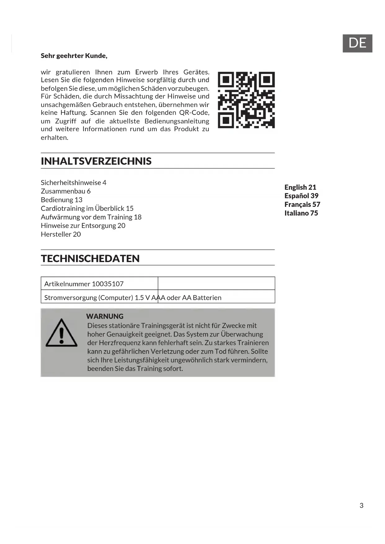 English 21 Español 39 Français 57 Italiano 75 Sehr geehrter Kunde, wir gratulieren Ihnen zum Erwerb Ihres Gerätes. Lesen Sie die folgenden Hinweise sorgfältig durch und befolgen Sie diese, um möglichen Schäden vorzubeugen. Für Schäden, die durch Missachtung der Hinweise und unsachgemäßen Gebrauch entstehen, übernehmen wir keine Haftung. Scannen Sie den folgenden QR-Code, um Zugriff auf die aktuellste Bedienungsanleitung und weitere Informationen rund um das Produkt zu erhalten. INHALTSVERZEICHNIS Sicherheitshinweise 4 Zusammenbau 6 Bedienung 13 Cardiotraining im Überblick 15 Aufwärmung vor dem Training 18 Hinweise zur Entsorgung 20 Hersteller 20 TECHNISCHE DATEN Artikelnummer 10035107 Stromversorgung (Computer) 1.5 V AAA oder AA Batterien WARNUNG Dieses stationäre Trainingsgerät ist nicht für Zwecke mit hoher Genauigkeit geeignet. Das System zur Überwachung der Herzfrequenz kann fehlerhaft sein. Zu starkes Trainieren kann zu gefährlichen Verletzung oder zum Tod führen. Sollte sich Ihre Leistungsfähigkeit ungewöhnlich stark vermindern, beenden Sie das Training sofort.4