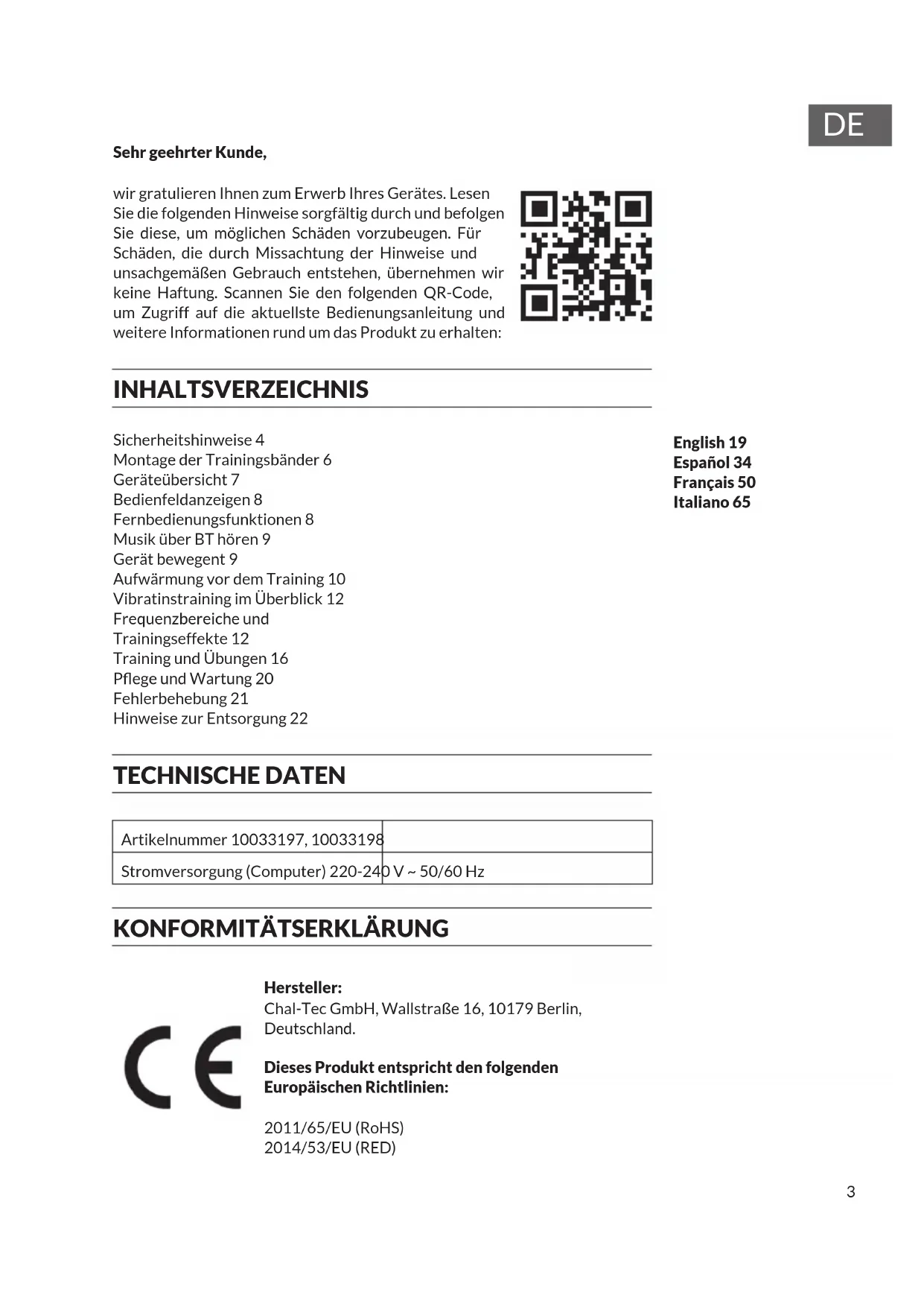 English 19 Español 34 Français 50 Italiano 65 Sehr geehrter Kunde, wir gratulieren Ihnen zum Erwerb Ihres Gerätes. Lesen Sie die folgenden Hinweise sorgfältig durch und befolgen Sie diese, um möglichen Schäden vorzubeugen. Für Schäden, die durch Missachtung der Hinweise und unsachgemäßen Gebrauch entstehen, übernehmen wir keine Haftung. Scannen Sie den folgenden QR-Code, um Zugriff auf die aktuellste Bedienungsanleitung und weitere Informationen rund um das Produkt zu erhalten: INHALTSVERZEICHNIS Sicherheitshinweise 4 Montage der Trainingsbänder 6 Geräteübersicht 7 Bedienfeldanzeigen 8 Fernbedienungsfunktionen 8 Musik über BT hören 9 Gerät bewegent 9 Aufwärmung vor dem Training 10 Vibratinstraining im Überblick 12 Frequenzbereiche und Trainingseffekte 12 Training und Übungen 16 Pege und Wartung 20 Fehlerbehebung 21 Hinweise zur Entsorgung 22 TECHNISCHE DATEN Artikelnummer 10033197, 10033198 Stromversorgung (Computer) 220-240 V ~ 50/60 Hz