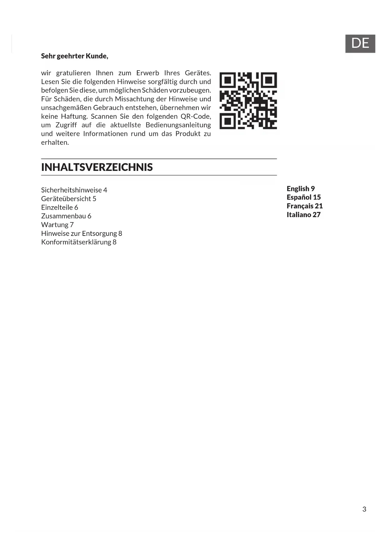 English 9 Español 15 Français 21 Italiano 27 Sehr geehrter Kunde, wir gratulieren Ihnen zum Erwerb Ihres Gerätes. Lesen Sie die folgenden Hinweise sorgfältig durch und befolgen Sie diese, um möglichen Schäden vorzubeugen. Für Schäden, die durch Missachtung der Hinweise und unsachgemäßen Gebrauch entstehen, übernehmen wir keine Haftung. Scannen Sie den folgenden QR-Code, um Zugriff auf die aktuellste Bedienungsanleitung und weitere Informationen rund um das Produkt zu erhalten. INHALTSVERZEICHNIS Sicherheitshinweise 4 Geräteübersicht 5 Einzelteile 6 Zusammenbau 6 Wartung 7 Hinweise zur Entsorgung 8 Konformitätserklärung 84