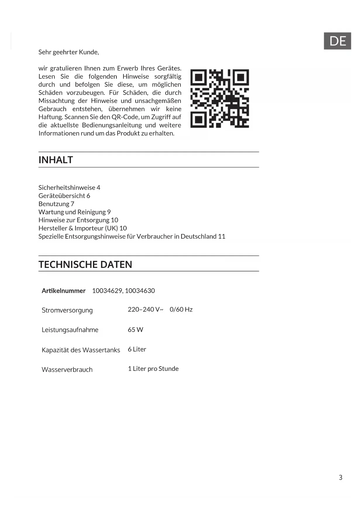 Sehr geehrter Kunde, wir gratulieren Ihnen zum Erwerb Ihres Gerätes. Lesen Sie die folgenden Hinweise sorgfältig durch und befolgen Sie diese, um möglichen Schäden vorzubeugen. Für Schäden, die durch Missachtung der Hinweise und unsachgemäßen Gebrauch entstehen, übernehmen wir keine Haftung. Scannen Sie den QR-Code, um Zugriff auf die aktuellste Bedienungsanleitung und weitere Informationen rund um das Produkt zu erhalten. INHALT Sicherheitshinweise 4 Geräteübersicht 6 Benutzung 7 Wartung und Reinigung 9 Hinweise zur Entsorgung 10 Hersteller & Importeur (UK) 10 Spezielle Entsorgungshinweise für Verbraucher in Deutschland 11 TECHNISCHE DATEN Arkelnummer 10034629, 10034630 Stromversorgung 220–240 V~ 0/60 Hz Leistungsaufnahme 65 W Kapazität des Wassertanks 6 Liter Wasserverbrauch 1 Liter pro Stunde
