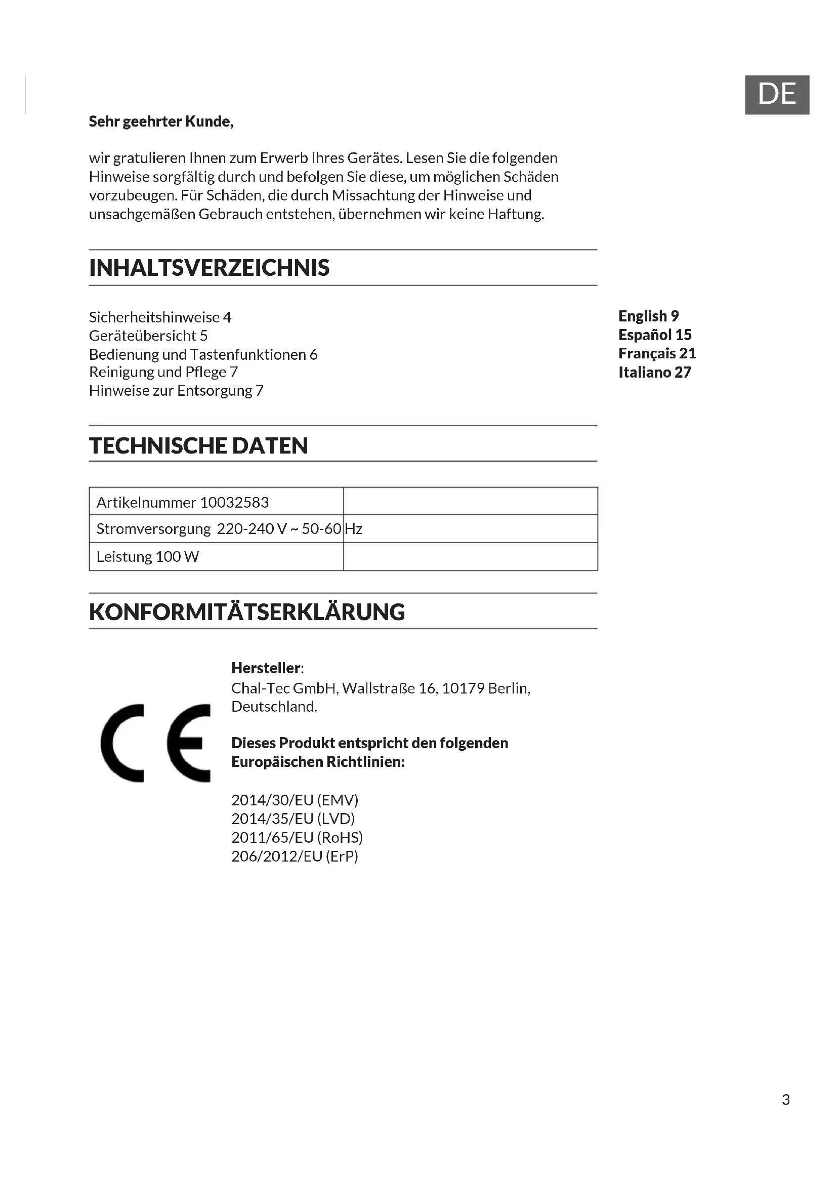 English 9 Español 15 Français 21 Italiano 27 Sehr geehrter Kunde, wir gratulieren Ihnen zum Erwerb Ihres Gerätes. Lesen Sie die folgenden Hinweise sorgfältig durch und befolgen Sie diese, um möglichen Schäden vorzubeugen. Für Schäden, die durch Missachtung der Hinweise und unsachgemäßen Gebrauch entstehen, übernehmen wir keine Haftung. INHALTSVERZEICHNIS Sicherheitshinweise 4 Geräteübersicht 5 Bedienung und Tastenfunktionen 6 Reinigung und Pege 7 Hinweise zur Entsorgung 7 TECHNISCHE DATEN Artikelnummer 10032583 Stromversorgung 220-240 V ~ 50-60 Hz Leistung 100 W
