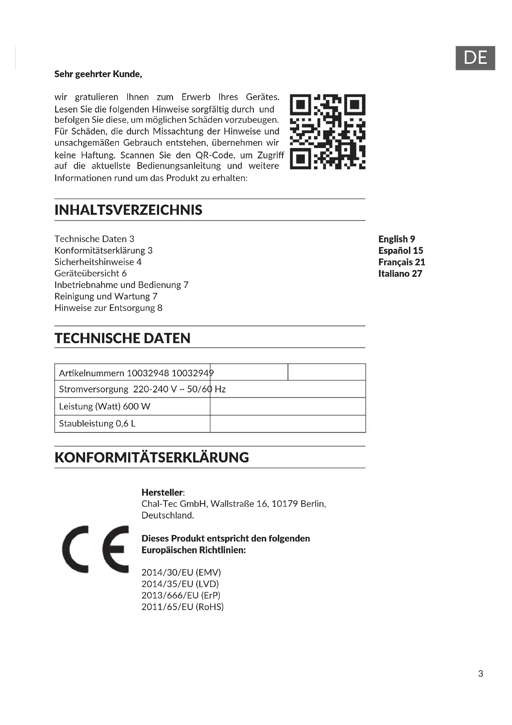 Hersteller: Chal-Tec GmbH, Wallstraße 16, 10179 Berlin, Deutschland. Dieses Produkt entspricht den folgenden Europäischen Richtlinien: 2014/30/EU (EMV) 2014/35/EU (LVD) 2013/666/EU (ErP) 2011/65/EU (RoHS) Sehr geehrter Kunde, wir gratulieren Ihnen zum Erwerb Ihres Gerätes. Lesen Sie die folgenden Hinweise sorgfälg durch und befolgen Sie diese, um möglichen Schäden vorzubeugen. Für Schäden, die durch Missachtung der Hinweise und unsachgemäßen Gebrauch entstehen, übernehmen wir keine Haung. Scannen Sie den QR-Code, um Zugri auf die aktuellste Bedienungsanleitung und weitere Informaonen rund um das Produkt zu erhalten: INHALTSVERZEICHNIS4