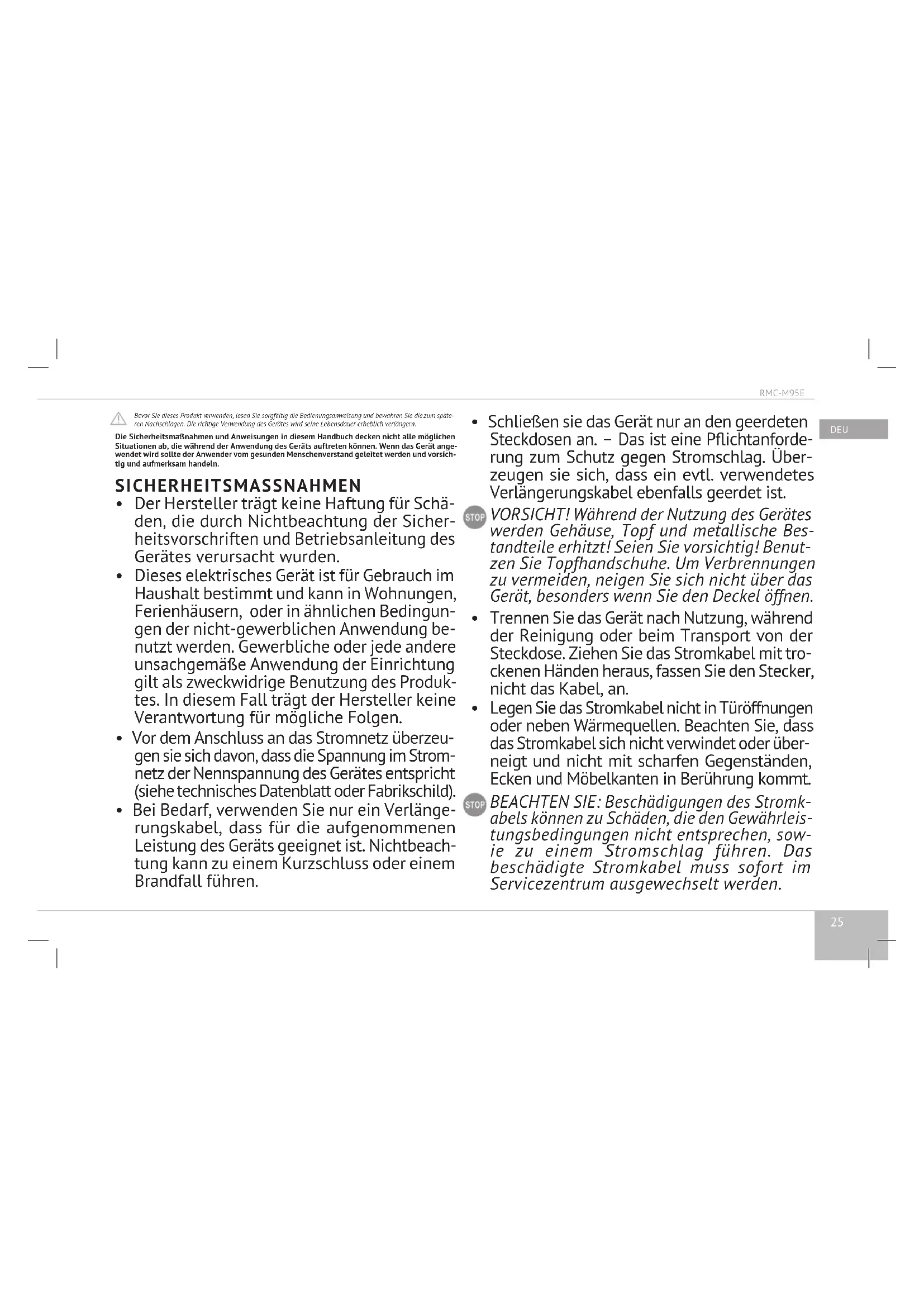 Fehler Fehlerursachen Abhilfe Auf Display erscheint Mittei- lung des Fehlers: E1 –E4 Systemfehler, es ist möglich Ausfall der Steue- rungsdisk oder des Heizelementes Schalten Sie das Gerät von Stromnetz ab, lassen Sie es abkühlen. Decken Sie dicht zu, schalten Sie das Gerät wieder ein Das Gerät wird nicht einge- schaltet Der Stromkabel ist am Gerät und/oder am Strom- netz nicht angeschlossen. Vergewissern Sie sich, dass das abnehmbare Stromkabel an den entsprechenden Anschluss und am Stromnetzt angeschlossen ist. Steckdose hat Defekt Schliessen Sie das Gerät an funktionierende Steckdose an Es gibt keinen Strom Prüfen Sie Stromspannung in Netz. Wenn es keine Stromspannung gibt, wenden Sie sich an die Servicerma. Das Gericht wird zu langsam zubereitet Stromunterbrechungen (Niveau der Stromspan- nung ist nicht stabil oder niedriger als Norm) Überprüfen Sie Anwesenheit der stabilen Stromspannung. Wenn sie nicht stabil ist oder niedriger als Norm, wenden Sie sich an die Servicerma. Zwischen der Schale und Heizelement gibt es Fremdkörper oder Schmutz, Gries, Speisereste. Schalten Sie das Gerät von Stromnetz ab, lassen Sie es abkühlen. Entfernen Sie den Fremdkörper oder Teilchen der Schmutz, Gries, Speisereste. Die Schale setzt in Multikocher nicht gerade. Setzen Sie die Schale gerade, ohne Verkanten Heizscheibe ist stark verschmutzt. Schalten Sie das Gerät von Stromnetz ab, lassen Sie es abkühlen. Reinigen Sie die Heizscheibe. Während der Zubereitung weicht der Dampf durch Deckel aus Dichtigkeit zwischen der Schale und dem Innende- ckel ist gestört Die Schale setzt in Multikocher nicht gerade. Setzen Sie die Schale gerade, ohne Verkanten Deckel ist nicht dicht zugedeckt oder es gibt den Fremdkörper unter Deckel Überprüfen Sie, ob es Fremdkörper oder Schmutz, Gries, Speise- reste zwischen Deckel und Gerätkörper gibt, entfernen Sie sie. Decken Sie immer den Multikocherdeckel bis zum Einrasten zu. Dichtgummi des Innendeckels ist stark verschmutzt, deformiert oder hat Defekte. Prüfen Sie den Zustand des Dichtgummis des Innendeckels von Gerät. Es ist möglich, dass es gewechselt sein muss. Im Falle, dass Sie die Defekte nicht behandeln können, wenden Sie sich an das autorisierte Service Center.33 RMC-M95E GBR FRA DEU ITA ESP PRT DNK NOR SWE FIN ROU HUN BGR HRV CZE SVK SVN POL LTU LVA EST SRB GRC RUS UKR Umweltfreundliche Entsorgung Die Entsorgung von Verpackung, Bedienungsanleitung sowie das Gerät selbst muss nach den lokalen Recycling-Programme durchgeführt werden. Kümmern Sie um die Umwelt: werfen Sie es nicht in den normalen Müll, sondern geben Sie es an bestimmtes Sondermüll Depot ab. Alte Elektrogeräte dürfen nicht mehr zusammen mit dem Restmüll entsorgt werden, sondern müssen getrennt erfasst werden. Die Abgabe bei den kommunalen Sammelstellen durch Privatpersonen ist kostenfrei. Die Besitzer von Altgeräten sind verpichtet, die Geräte zu den Sammelstellen zu bringen oder bei einer entsprechenden Sammlung abzugeben. Mit diesem kleinen persönlichen Aufwand tragen Sie weiterhin dazu bei, dass wertvolle Rohstoffe recycelt und Schadstoffe gezielt behandelt werden können. Dieses Produkt entspricht den Vorschriften der EU-Richtlinie 2012/19/EU über Elektro- und Elektronik-Altgeräte. Diese Richtlinie bestimmt den Rahmen der Rückgabe und des Recyclings von Elektro- und Elektronik-Altgeräten innerhalb der EU.34 Prima di iniziare l’utilizzo dell’apparecchio leggere attentamente le istruzioni. L’uso corretto dell’apparecchio ne pro- lunga notevolmente la durata. Misure di sicurezza e istruzioni contenuti in questo manuale non coprono tutte le situazioni che possono emergere nel processo d’utilizzo dell’apparecchio. Usando l’apparecchio l’utente deve agire con ragionevolezza, essere cauto e attento.