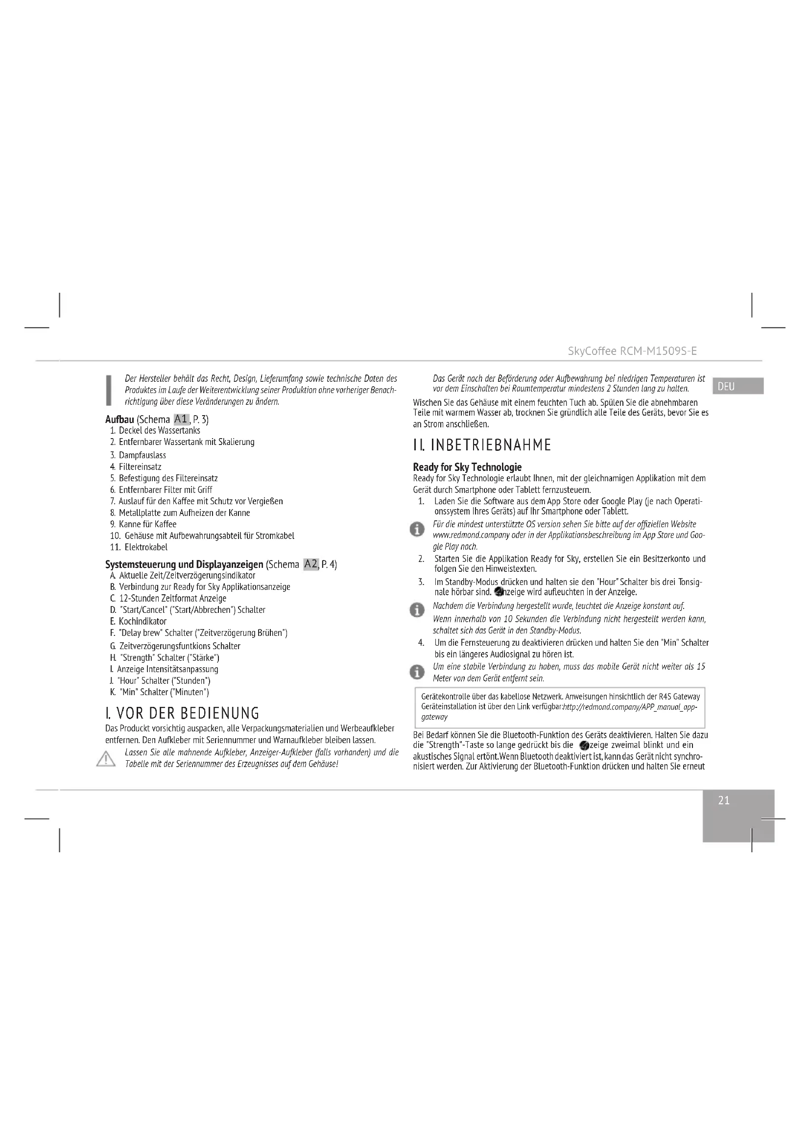 , P. 4) A. Aktuelle Zeit/Zeitverzögerungsindikator B. Verbindung zur Ready for Sky Applikationsanzeige C. 12-Stunden Zeitformat Anzeige D. "Start/Cancel" ("Start/Abbrechen") Schalter E. Kochindikator F. "Delay brew" Schalter ("Zeitverzögerung Brühen") G. Zeitverzögerungsfuntkions Schalter H. "Strength" Schalter ("Stärke")