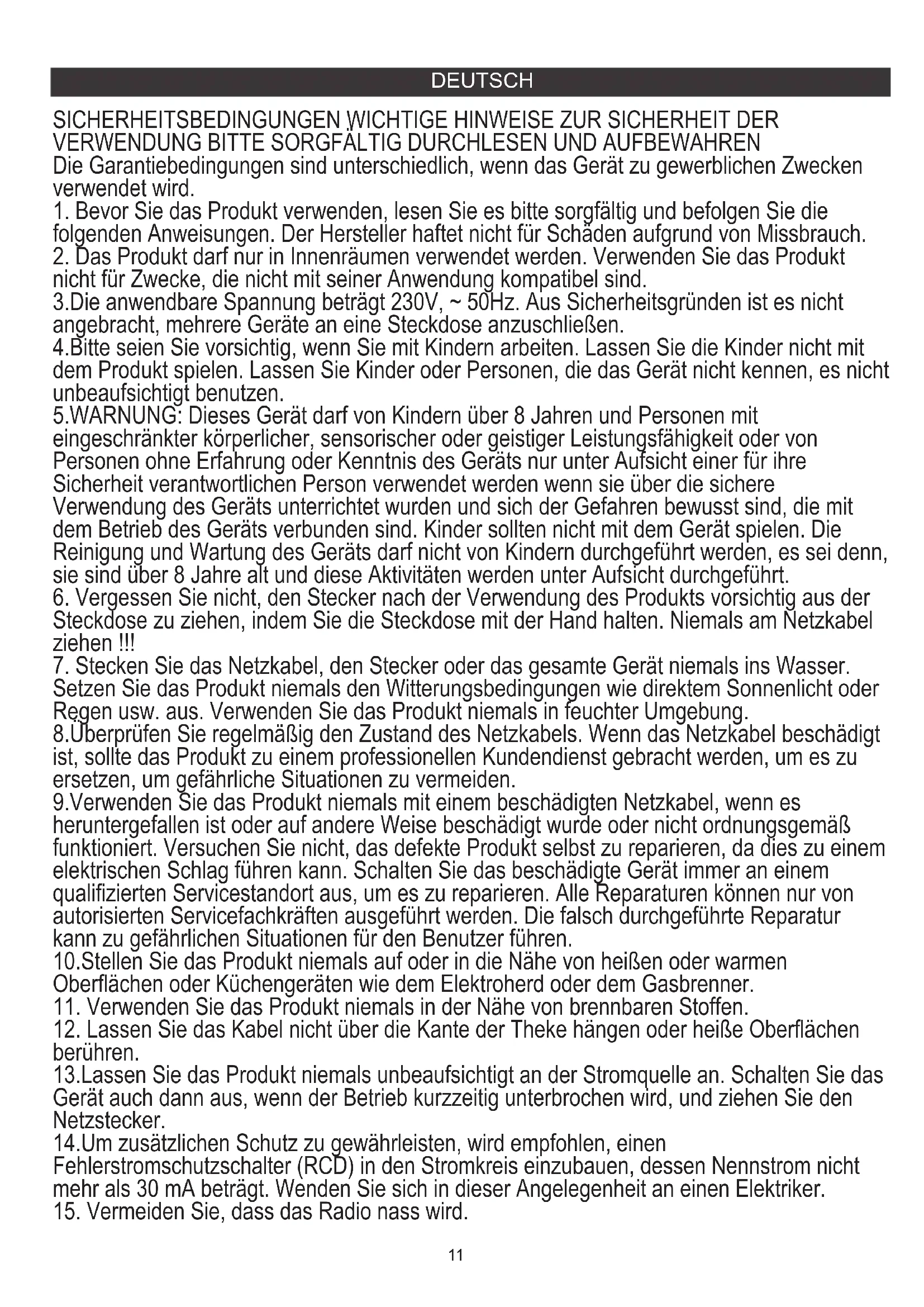 15. Vermeiden Sie, dass das Radio nass wird.12
