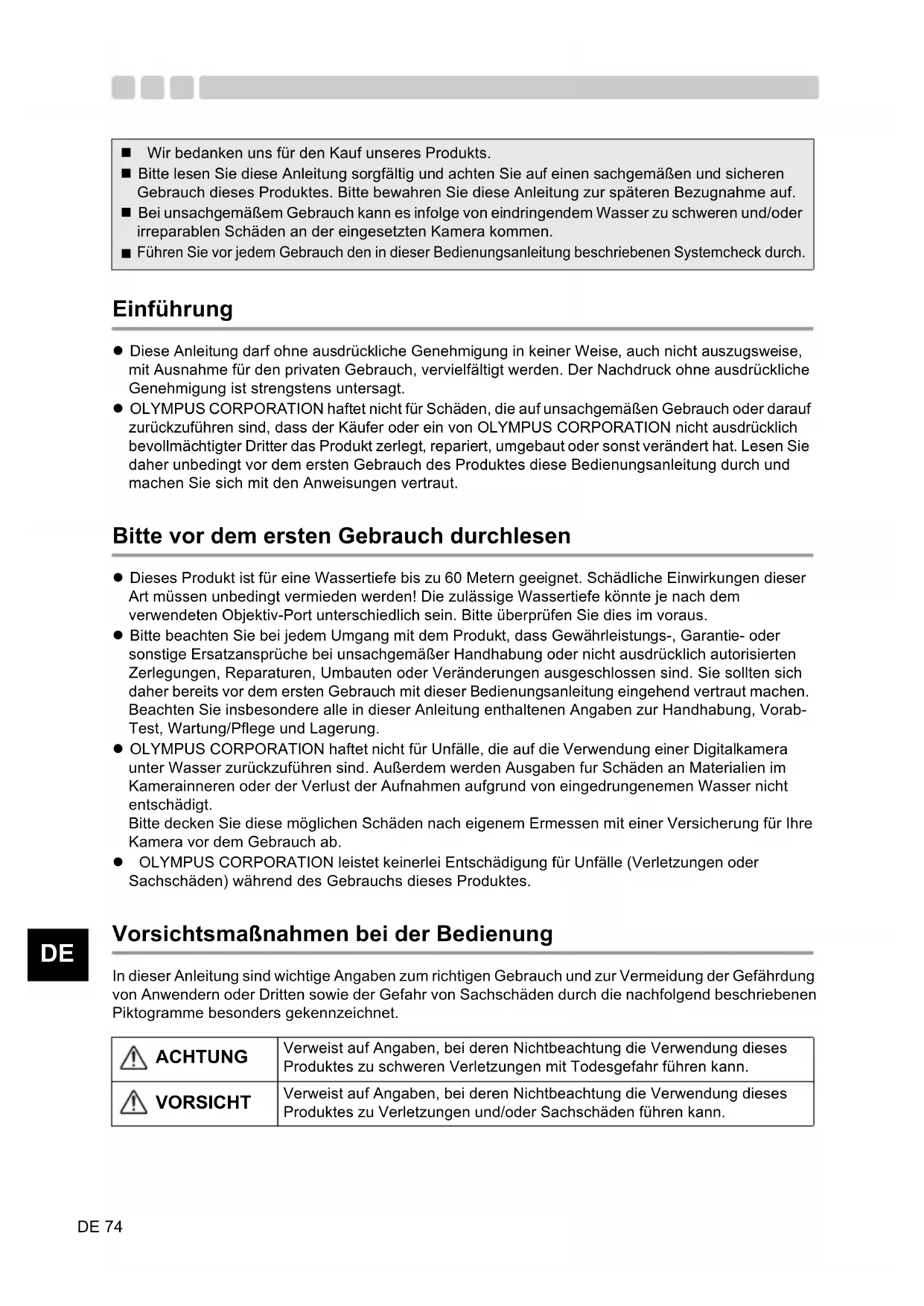 Einführung z Diese Anleitung darf ohne ausdrückliche Genehmigung in keiner Weise, auch nicht auszugsweise, mit Ausnahme für den privaten Gebrauch, vervielfältigt werden. Der Nachdruck ohne ausdrückliche Genehmigung ist strengstens untersagt. z OLYMPUS CORPORATION haftet nicht für Schäden, die auf unsachgemäßen Gebrauch oder darauf zurückzuführen sind, dass der Käufer oder ein von OLYMPUS CORPORATION nicht ausdrücklich bevollmächtigter Dritter das Produkt zerlegt, repariert, umgebaut oder sonst verändert hat. Lesen Sie daher unbedingt vor dem ersten Gebrauch des Produktes diese Bedienungsanleitung durch und machen Sie sich mit den Anweisungen vertraut. Bitte vor dem ersten Gebrauch durchlesen z Dieses Produkt ist für eine Wassertiefe bis zu 60 Metern geeignet. Schädliche Einwirkungen dieser Art müssen unbedingt vermieden werden! Die zulässige Wassertiefe könnte je nach dem verwendeten Objektiv-Port unterschiedlich sein. Bitte überprüfen Sie dies im voraus. z Bitte beachten Sie bei jedem Umgang mit dem Produkt, dass Gewährleistungs-, Garantie- oder sonstige Ersatzansprüche bei unsachgemäßer Handhabung oder nicht ausdrücklich autorisierten Zerlegungen, Reparaturen, Umbauten oder Veränderungen ausgeschlossen sind. Sie sollten sich daher bereits vor dem ersten Gebrauch mit dieser Bedienungsanleitung eingehend vertraut machen. Beachten Sie insbesondere alle in dieser Anleitung enthaltenen Angaben zur Handhabung, Vorab- Test, Wartung/Pflege und Lagerung. z OLYMPUS CORPORATION haftet nicht für Unfälle, die auf die Verwendung einer Digitalkamera unter Wasser zurückzuführen sind. Außerdem werden Ausgaben fur Schäden an Materialien im Kamerainneren oder der Verlust der Aufnahmen aufgrund von eingedrungenemen Wasser nicht entschädigt. Bitte decken Sie diese möglichen Schäden nach eigenem Ermessen mit einer Versicherung für Ihre Kamera vor dem Gebrauch ab. z OLYMPUS CORPORATION leistet keinerlei Entschädigung für Unfälle (Verletzungen oder Sachschäden) während des Gebrauchs dieses Produktes. Vorsichtsmaßnahmen bei der Bedienung In dieser Anleitung sind wichtige Angaben zum richtigen Gebrauch und zur Vermeidung der Gefährdung von Anwendern oder Dritten sowie der Gefahr von Sachschäden durch die nachfolgend beschriebenen Piktogramme besonders gekennzeichnet. Wir bedanken uns für den Kauf unseres Produkts. Bitte lesen Sie diese Anleitung sorgfältig und achten Sie auf einen sachgemäßen und sicheren Gebrauch dieses Produktes. Bitte bewahren Sie diese Anleitung zur späteren Bezugnahme auf. Bei unsachgemäßem Gebrauch kann es infolge von eindringendem Wasser zu schweren und/oder irreparablen Schäden an der eingesetzten Kamera kommen.