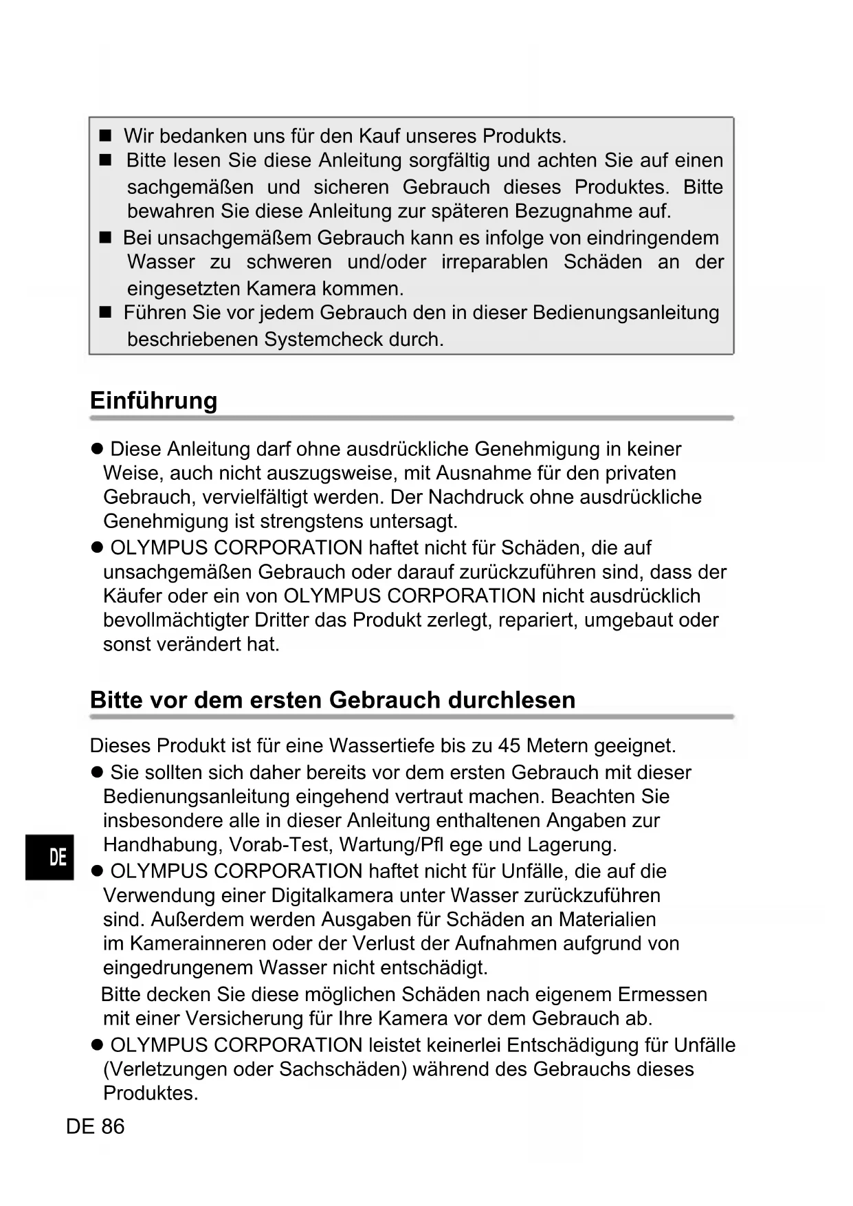 Wir bedanken uns für den Kauf unseres Produkts. Bitte lesen Sie diese Anleitung sorgfältig und achten Sie auf einen sachgemäßen und sicheren Gebrauch dieses Produktes. Bitte bewahren Sie diese Anleitung zur späteren Bezugnahme auf. Bei unsachgemäßem Gebrauch kann es infolge von eindringendem Wasser zu schweren und/oder irreparablen Schäden an der eingesetzten Kamera kommen. Führen Sie vor jedem Gebrauch den in dieser Bedienungsanleitung beschriebenen Systemcheck durch. Einführung Diese Anleitung darf ohne ausdrückliche Genehmigung in keiner Weise, auch nicht auszugsweise, mit Ausnahme für den privaten Gebrauch, vervielfältigt werden. Der Nachdruck ohne ausdrückliche Genehmigung ist strengstens untersagt. OLYMPUS CORPORATION haftet nicht für Schäden, die auf unsachgemäßen Gebrauch oder darauf zurückzuführen sind, dass der Käufer oder ein von OLYMPUS CORPORATION nicht ausdrücklich bevollmächtigter Dritter das Produkt zerlegt, repariert, umgebaut oder sonst verändert hat. Bitte vor dem ersten Gebrauch durchlesen Dieses Produkt ist für eine Wassertiefe bis zu 45 Metern geeignet. Sie sollten sich daher bereits vor dem ersten Gebrauch mit dieser Bedienungsanleitung eingehend vertraut machen. Beachten Sie insbesondere alle in dieser Anleitung enthaltenen Angaben zur Handhabung, Vorab-Test, Wartung/Pfl ege und Lagerung. OLYMPUS CORPORATION haftet nicht für Unfälle, die auf die Verwendung einer Digitalkamera unter Wasser zurückzuführen sind. Außerdem werden Ausgaben für Schäden an Materialien im Kamerainneren oder der Verlust der Aufnahmen aufgrund von eingedrungenem Wasser nicht entschädigt. Bitte decken Sie diese möglichen Schäden nach eigenem Ermessen mit einer Versicherung für Ihre Kamera vor dem Gebrauch ab. OLYMPUS CORPORATION leistet keinerlei Entschädigung für Unfälle (Verletzungen oder Sachschäden) während des Gebrauchs dieses Produktes.DE 87