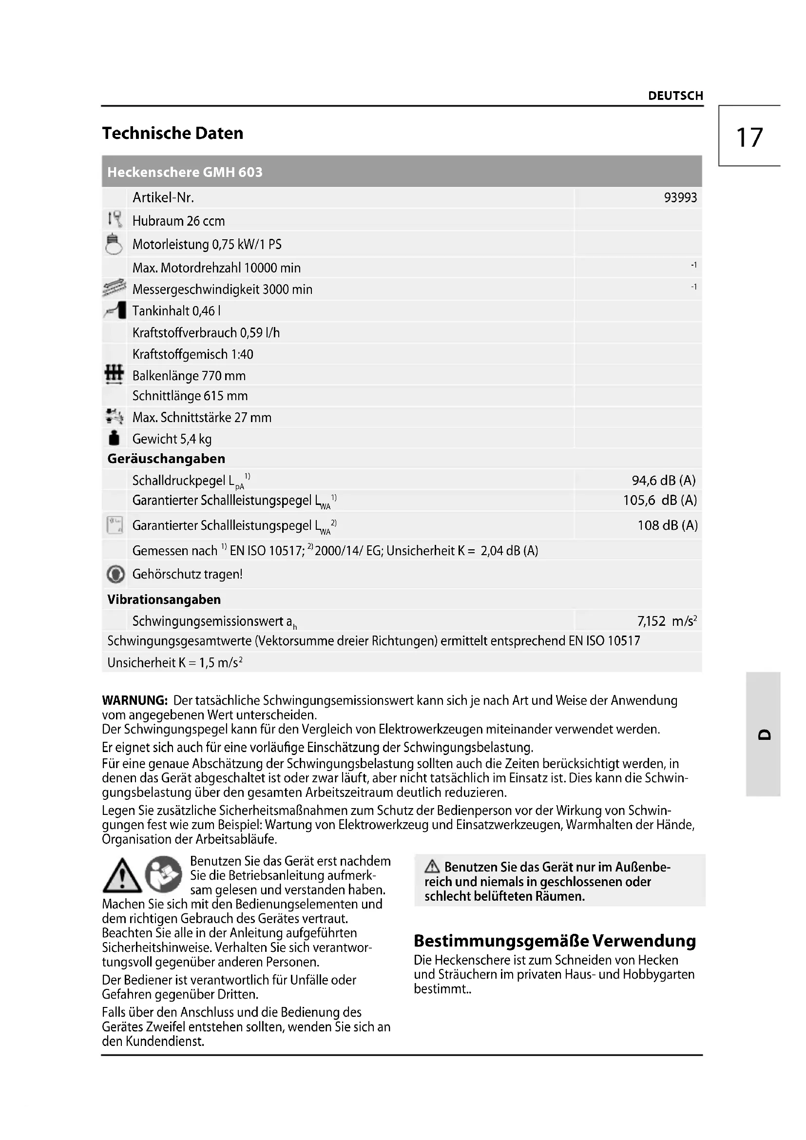 Technische Daten Heckenschere GMH 603 Artikel-Nr.