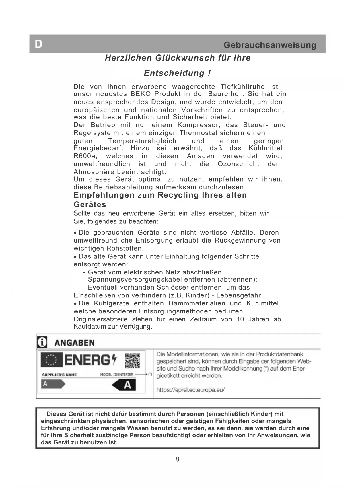 Recyclage Ce produit est marqué du symbole du tri sélectif, relatif aux déchets d'équipements électriques et électroniques. Cela signifie que ce produit doit être pris en charge par un système de collecte sélectif conformément à la directive européenne 20//8(, afin de pouvoir être recyclé ou démantelé dans le but de réduire tout impact sur l'environnement. Attention les produits électroniques n'ayant pas fait l'objet d'un tri sélectif sont potentiellement dangereux pour l'environnement et la santé humaine en raison de la présence potentielle de substances dangereuses.Herzlichen Glückwunsch für Ihre Entscheidung ! Die von Ihnen erworbene waagerechte Tiefkühltruhe ist unser neuestes BEKO Produkt in der Baureihe . Sie hat ein neues ansprechendes Design, und wurde entwickelt, um den europäischen und nationalen Vorschriften zu entsprechen, was die beste Funktion und Sicherheit bietet. Der Betrieb mit nur einem Kompressor, das Steuer- und Regelsyste mit einem einzigen Thermostat sichern einen guten Temperaturabgleich und einen geringen Energiebedarf. Hinzu sei erwähnt, daß das Kühlmittel R600a, welches in diesen Anlagen verwendet wird, umweltfreundlich ist und nicht die Ozonschicht der Atmosphäre beeintrachtigt. Um dieses Gerät optimal zu nutzen, empfehlen wir ihnen, diese Betriebsanleitung aufmerksam durchzulesen. Empfehlungen zum Recycling Ihres alten Gerätes Sollte das neu erworbene Gerät ein altes ersetzen, bitten wir Sie, folgendes zu beachten: x Die gebrauchten Geräte sind nicht wertlose Abfälle. Deren umweltfreundliche Entsorgung erlaubt die Rückgewinnung von wichtigen Rohstoffen. x Das alte Gerät kann unter Einhaltung folgender Schritte entsorgt werden: - Gerät vom elektrischen Netz abschließen - Spannungsversorgungskabel entfernen (abtrennen); - Eventuell vorhanden Schlösser entfernen, um das Einschließen von verhindern (z.B. Kinder) - Lebensgefahr. x Die Kühlgeräte enthalten Dämmmaterialien und Kühlmittel, welche besonderen Entsorgungsmethoden bedürfen. Originalersatzteile stehen für einen Zeitraum von 10 Jahren ab Kaufdatum zur Verfügung.