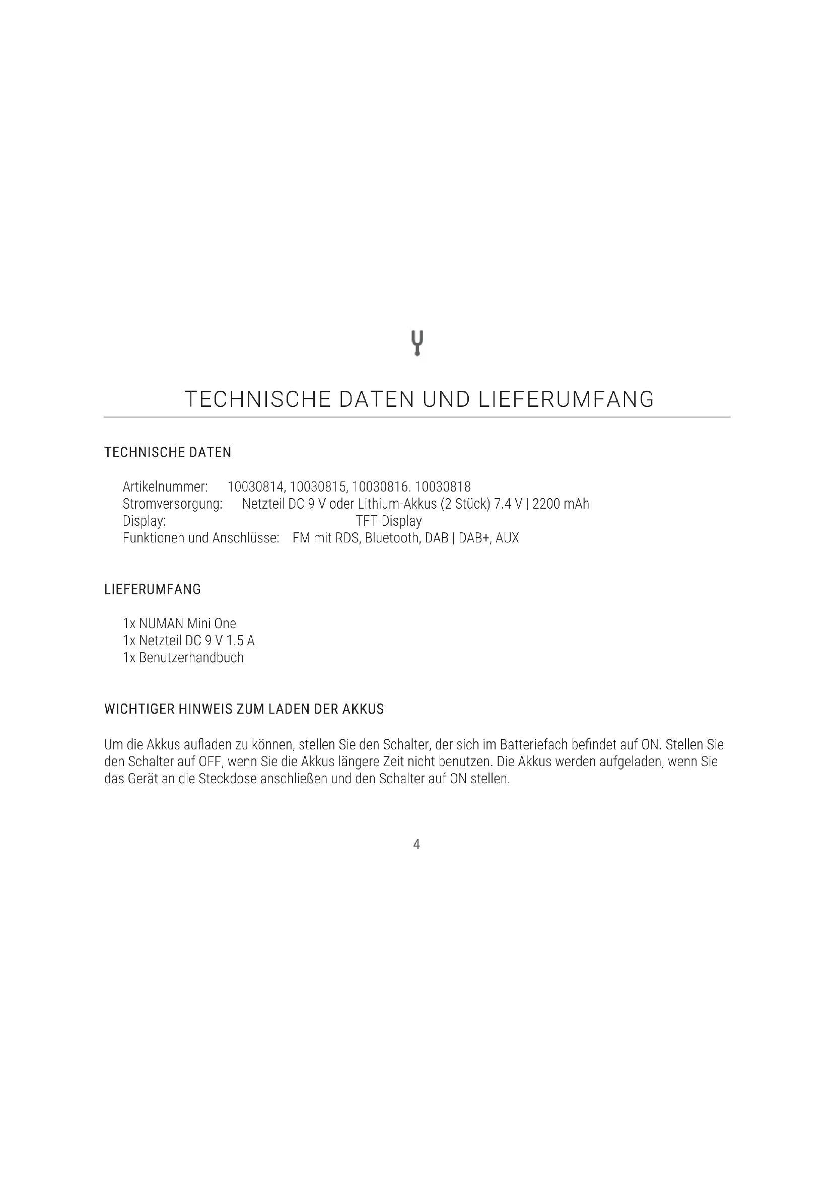 TECHNISCHE DATEN Artikelnummer: 10030814, 10030815, 10030816. 10030818 Stromversorgung: Netzteil DC 9 V oder Lithium-Akkus (2 Stück) 7.4 V | 2200 mAh Display: TFT-Display Funktionen und Anschlüsse: FM mit RDS, Bluetooth, DAB | DAB+, AUX LIEFERUMFANG 1x NUMAN Mini One 1x Netzteil DC 9 V 1.5 A 1x Benutzerhandbuch