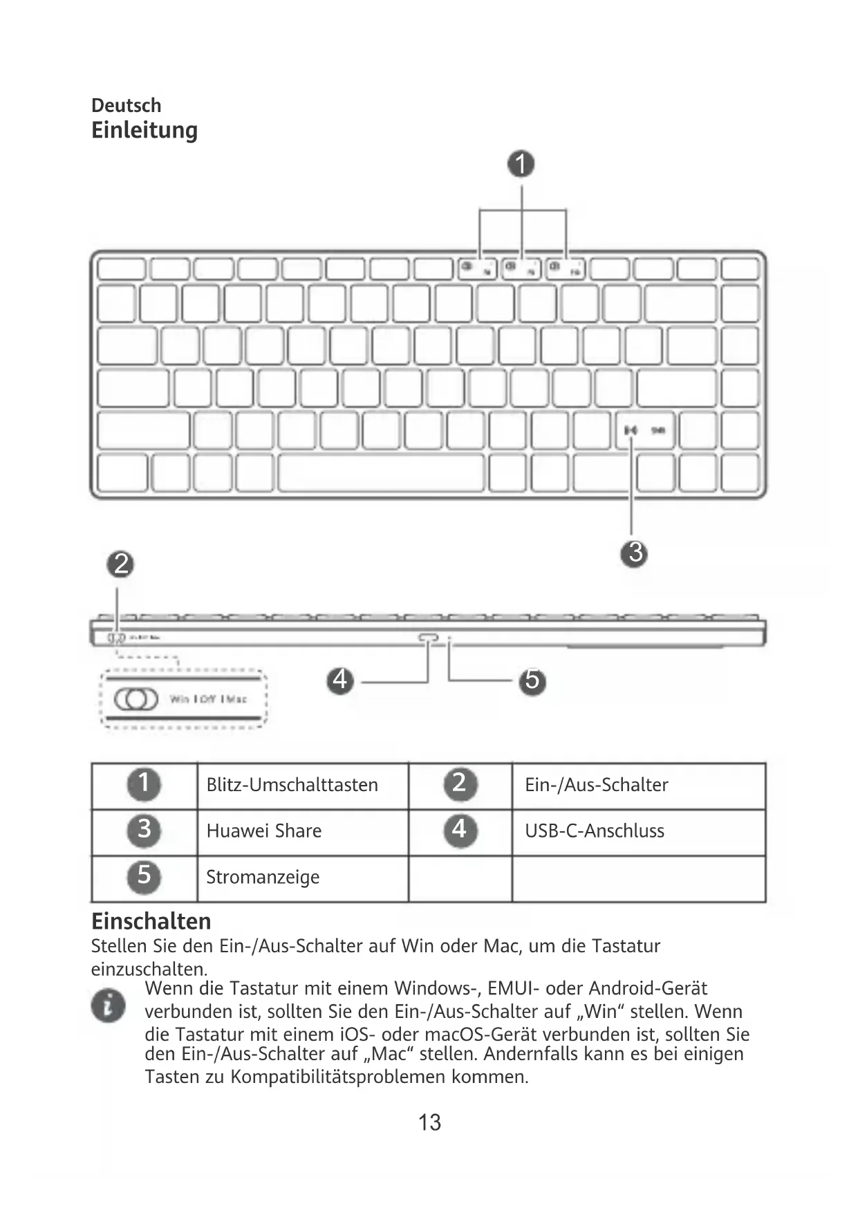 Stromanzeige Einschalten Stellen Sie den Ein-/Aus-Schalter auf Win oder Mac, um die Tastatur einzuschalten. Wenn die Tastatur mit einem Windows-, EMUI- oder Android-Gerät verbunden ist, sollten Sie den Ein-/Aus-Schalter auf „Win“ stellen. Wenn die Tastatur mit einem iOS- oder macOS-Gerät verbunden ist, sollten Sie den Ein-/Aus-Schalter auf „Mac“ stellen. Andernfalls kann es bei einigen Tasten zu Kompatibilitätsproblemen kommen. 13Verbinden 1 Stellen Sie die Tastatur in die Nähe eines Geräts und halten Sie eine beliebige Blitz-Umschalttaste länger als drei Sekunden gedrückt, um den Kopplungsvorgang zu starten. (Nach dem ersten Einschalten der Tastatur startet sie den Kopplungsvorgang automatisch, ohne dass Sie eine Blitz- Umschalttaste drücken und halten müssen.) 2 Auf dem Gerät wird eine Eingabeauorderung angezeigt. Befolgen Sie die Bildschirmanweisungen, um den Kopplungsvorgang fertigzustellen.
