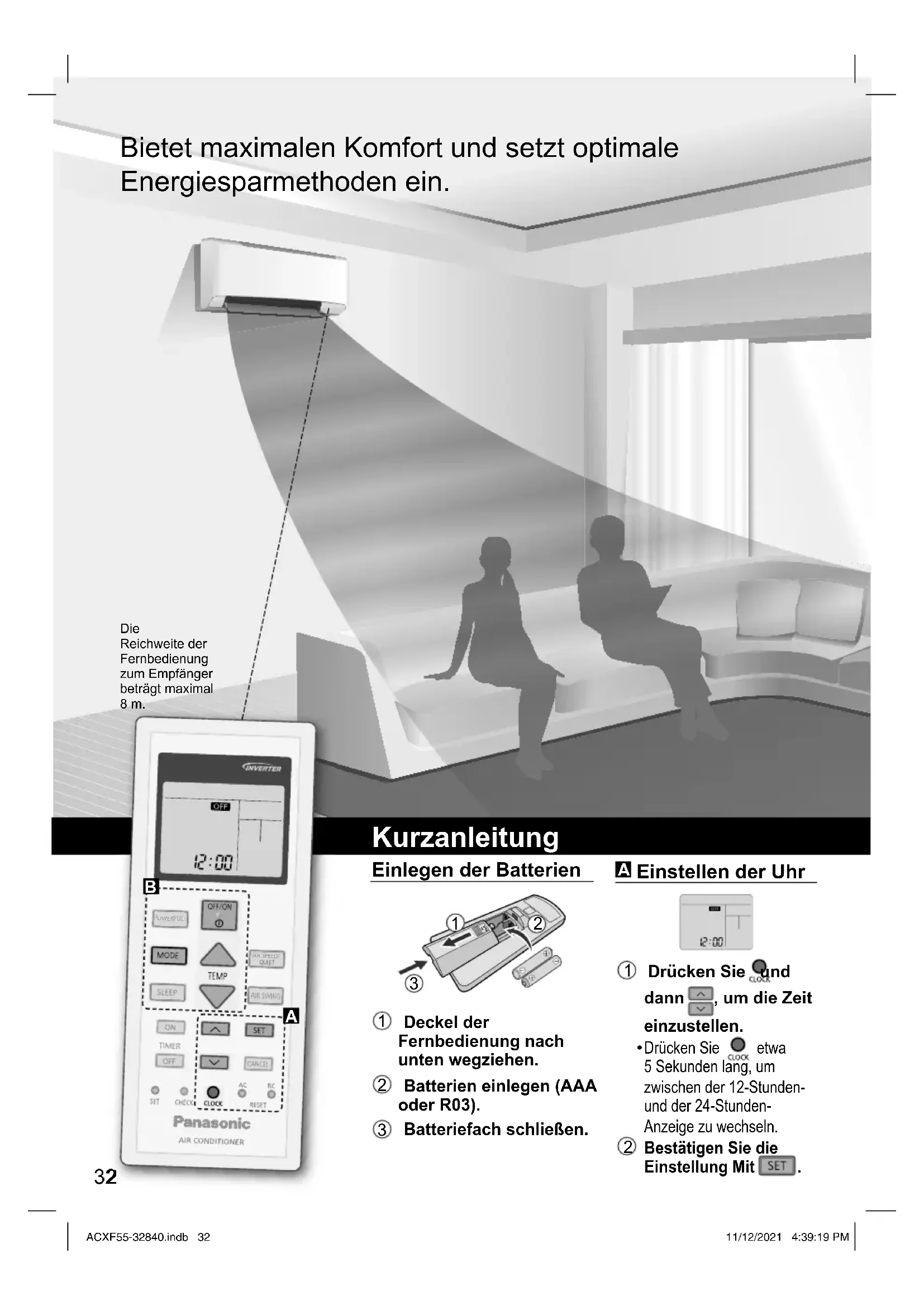 - Einige Fehlercodes gelten möglicherweise nicht für Ihr Modell. Zur Klärung wenden Sie sich an einen Fachhändler. Diagnosean- zeige Anomalie/Schutzmaßnahme H 00 Kein Fehlerspeicher H 11 Anormale Kommunikation zwischen Innengerät/ Außengerät H 12 Kapazität des Innengeräts unpassend H 14 Anormalität beim Ansauglufttemperatursensor des Innengeräts H 15 Anormalität beim Verdichter-Temperatursensor des Außengeräts H 16 Anormalität beim Stromwandler (CT) des Außengeräts H 17 Anormalität beim Ansaugtemperatursensor des Außengeräts H 19 Sperre des Ventilatormotorantriebs der Inneneinheit H 21 Anormalität beim Schwimmerschalterbetrieb des Innengeräts H 23 Anormalität beim Wärmeaustauscher- Temperatursensor 1 des Innengeräts H 24 Anormalität beim Wärmeaustauscher- Temperatursensor 2 des Innengeräts H 25 Anormalität bei der Ionenanlage des Innengeräts H 26 Minus-Ionen-Anomalie H 27 Anormalität beim Außenluft-Temperatursensor H 28 Anormalität beim Wärmeaustauscher- Temperatursensor 1 des Außengeräts H 30 Anormalität beim Austrittsrohr-Temperatursensor des Außengeräts H 31 Anormaler Schwimmbadsensor H 32 Anormalität beim Wärmeaustauscher- Temperatursensor 2 des Außengeräts H 33 Anormalität durch Innengerät/Außengerät- Fehlverbindung H 34 Anormalität beim Kühlblech-Temperatursensor des Außengeräts H 35 Anormalität bei der Wassergegenströmung im Innengerät/Außengerät H 36 Anormalität beim Gasleitung-Temperatursensor des Außengeräts H 37 Anormalität beim Flüssigkeitsleitung- Temperatursensor des Außengeräts H 38 Fehlanpassung beim Innengerät/Außengerät (Markencode) Diagnosean- zeige Anomalie/Schutzmaßnahme H 39 Anormale Innengerät-Bedieneinheit oder Standby- Einheiten H 41 Anormale Verdrahtungs- oder Rohrverbindung H 50 Gebläsemotor gesperrt H 51 Gebläsemotor gesperrt H 52 Befestigungsanormalität beim Links/Rechts- Begrenzungsschalter H 58 Anormalität beim Innen-Gassensor H 59 Anormalität beim Eco-Sensor H 64 Anormalität beim Hochdrucksensor des Außengeräts H 67 Nanoe-Anormalität H 70 Lichtsensor-Anormalität H 71 Anormalität beim DC-Kühlventilator in der Schalttafel H 72 Anormalität beim Speichertemperatursensor H 85 Anormale Kommunikation zwischen Innen- und WLAN-Modul H 97 Sperre des Ventilatormotorantriebs am Außengerät H 98 Innengerät-Hochdruckschutz H 99 Frostschutz der Innenbedieneinheit F 11 Schaltanormalität beim 4-Wege-Ventil F 16 Gesamtbetriebsstrom-Schutz F 17 Anormalität beim Einfrieren der Innengeräte im Standby F 18 Blockieranormalität bei der Trockenschaltung F 87 Überhitzungsschutz des Anschlusskastens F 90 Überspannungsschutz der lindleistungskompensation (PFC) F 91 Anormalität des Kühlzyklus F 93 Anormale Umdrehung des Außengerät- Verdichters F 94 Enddruck-Begrenzungssc hutz des Verdichters F 95 Hochdruckschutz des Außengeräts bei der Kühlung F 96 Überhitzungsschutz des Leistungstransistor- Moduls F 97 Verdichter-Überhitzungsschutz F 98 Gesamtbetriebsstrom-Schutz F 99 Erkennung von Gleichstromspitzen des Außengeräts ACXF55-32840.indb 40ACXF55-32840.indb 40 11/12/2021 4:39:22 PM11/12/2021 4:39:22 PM41 Deutsch Memo Störungssuche ACXF55-32840.indb 41ACXF55-32840.indb 41 11/12/2021 4:39:23 PM11/12/2021 4:39:23 PM42 Garantisce la massima sensazione di benessere con metodi di risparmio energetico ottimale. Usare il telecomando entro 8 metri dal ricevitore telecomando dell’unità interna. Guida Rapida Inserimento delle batterie OPEN