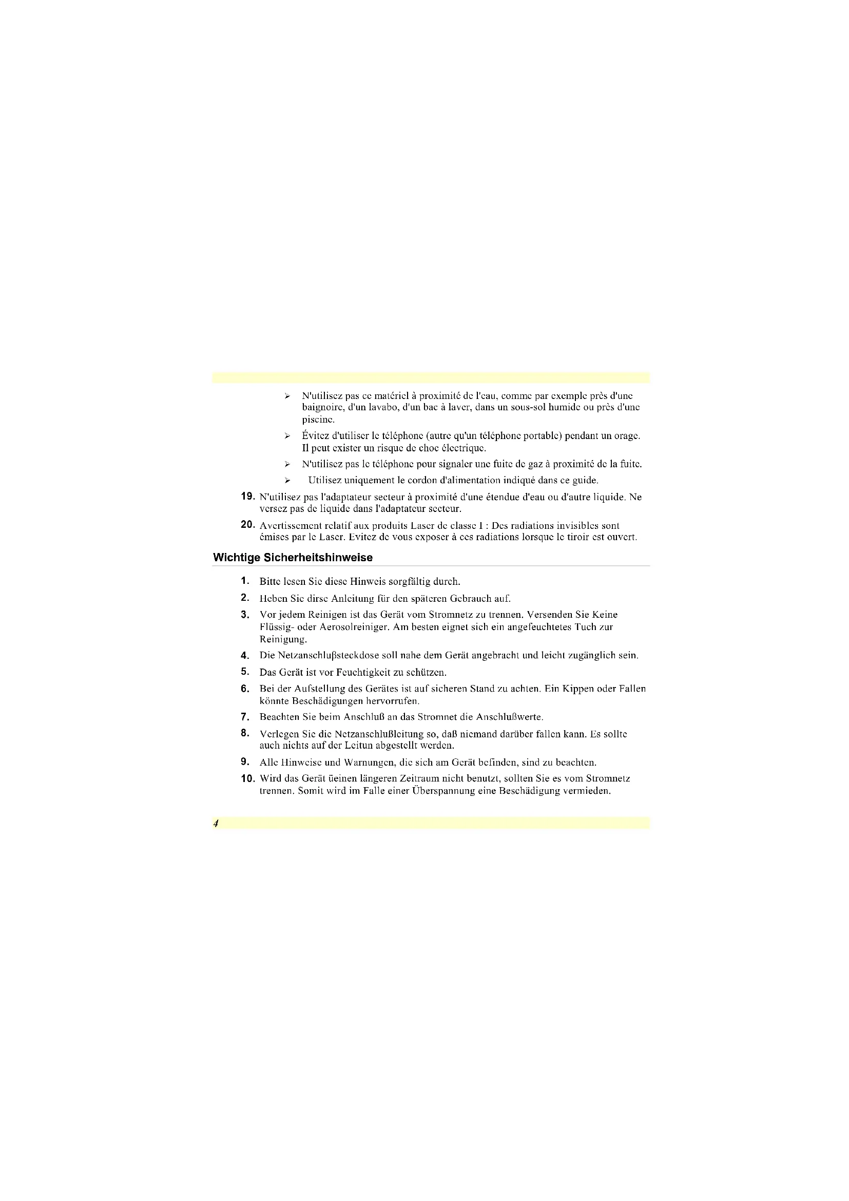 Bei der Benutzung Ihres Telefongerätes sollten Sie immer die grundlegenden Sicherheitsmaßnahmen beachten, um das Risiko von Feuer, Stromschlägen und Verletzungen zu minimieren. Zu beachten sind u.a. folgende Punkte: Benutzen Sie das Gerät nicht in der Nähe von Wasser, wie zum Beispiel Badewanne, Waschbecken, Spülbecken, Waschbottich, in feuchten Kellerräumen oder in der Nähe von Schwimmbecken. Benutzen Sie kein Telefon (ausgenommen schnurlose Modelle) während eines Gewitters. Es besteht das geringe Restrisiko eines Blitzschlages. Benutzen Sie das Telefon nicht um ein Gasleck zu melden, falls es sich in der Nähe des Lecks befindet. Benutzen Sie nur solch ein Stromkabel, wie in dieser Anleitung beschrieben. Benutzen Sie das Netzteil nicht in unmittelbarer Nähe zu Wasser oder anderen Flüssigkeiten. Gießen Sie nie Flüssigkeiten über das Netzteil. Achtung Laser: Laser Produkt der Klasse I. Achtung - Unsichtbarer Laserstrahl, vermeiden Sie Kontakt mit dem Strahl bei offenem Gehäuse. Es besteht Explosionsgefahr, wenn der Akku nicht ordnungsgemäß ersetzt wird. Ersetzen Sie den Akku nur durch einen Akku gleichen oder äquivalenten Typs, der vom Hersteller empfohlen wird. Entsorgen Sie Akkus entsprechend den Anweisungen des Herstellers. 6Entfernen Sie den Akku auf keinen Fall bei eingeschaltetem Notebook, da hierdurch Daten verloren gehen könnten. Précautions à observer lors de l'utilisation de votre ordinateur Laisser votre ordinateur s'adapter à la température ambiante Votre ordinateur portable peut facilement supporter des températures extrêmes, mais il est sensible aux brusques variations de température, rencontrées par exemple en passant d'un extérieur froid à un bureau chauffé. Les variations rapides de température peuvent causer un phénomène de condensation à l'intérieur du boîtier, pouvant endommager les composants électroniques qui s'y trouvent. Si vous recevez votre ordinateur alors que la température extérieure est chaude ou froide, ne le mettez pas en marche pas immédiatement, mais laissez-le s'adapter progressivement à la température de la pièce pendant au moins trois ou quatre heures. Si vous réceptionnez votre ordinateur alors que la température extérieure est froide, ne branchez pas votre ordinateur tant qu'il ne s'est pas adapté à la température de la pièce.