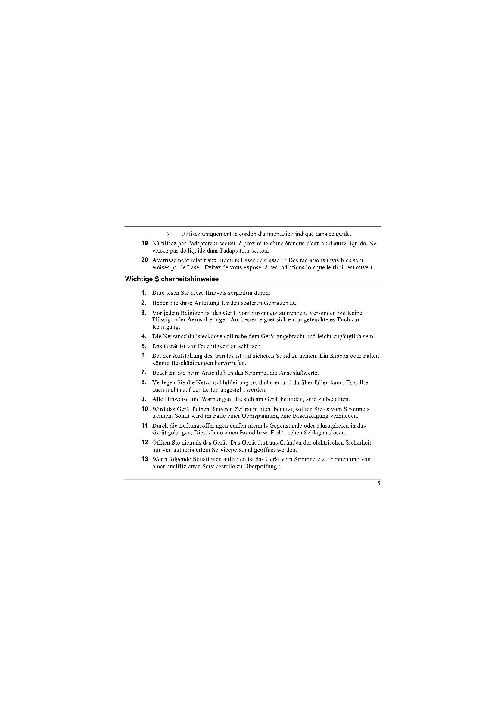 Bitte lesen Sie diese Hinweis sorgfältig durch. Heben Sie dirse Anleitung für den späteren Gebrauch auf. Vor jedem Reinigen ist das Gerät vom Stromnetz zu trennen. Versenden Sie Keine Flüssig- oder Aerosolreiniger. Am besten eignet sich ein angefeuchtetes Tuch zur Reinigung. Die Netzanschluβsteckdose soll nahe dem Gerät angebracht und leicht zugänglich sein. Das Gerät ist vor Feuchtigkeit zu schützen. Bei der Aufstellung des Gerätes ist auf sicheren Stand zu achten. Ein Kippen oder Fallen könnte Beschädigungen hervorrufen. Beachten Sie beim Anschluß an das Stromnet die Anschlußwerte. Verlegen Sie die Netzanschlußleitung so, daß niemand darüber fallen kann. Es sollte auch nichts auf der Leitun abgestellt werden. Alle Hinweise und Warnungen, die sich am Gerät befinden, sind zu beachten. Wird das Gerät üeinen längeren Zeitraum nicht benutzt, sollten Sie es vom Stromnetz trennen. Somit wird im Falle einer Überspannung eine Beschädigung vermieden. Durch die Lüftungsöffnungen dürfen niemals Gegenstände oder Flüssigkeien in das Gerät gelangen. Dies könne einen Brand bzw. Elektrischen Schlag auslösen. Öffnen Sie niemals das Gerät. Das Gerät darf aus Gründen der elektrischen Sicherheit nur von authorisiertem Servicepersonal geöffnet werden. Wenn folgende Situationen auftreten ist das Gerät vom Stromnetz zu trennen und von einer qualifizierten Servicestelle zu Überprüfung.: 5a.