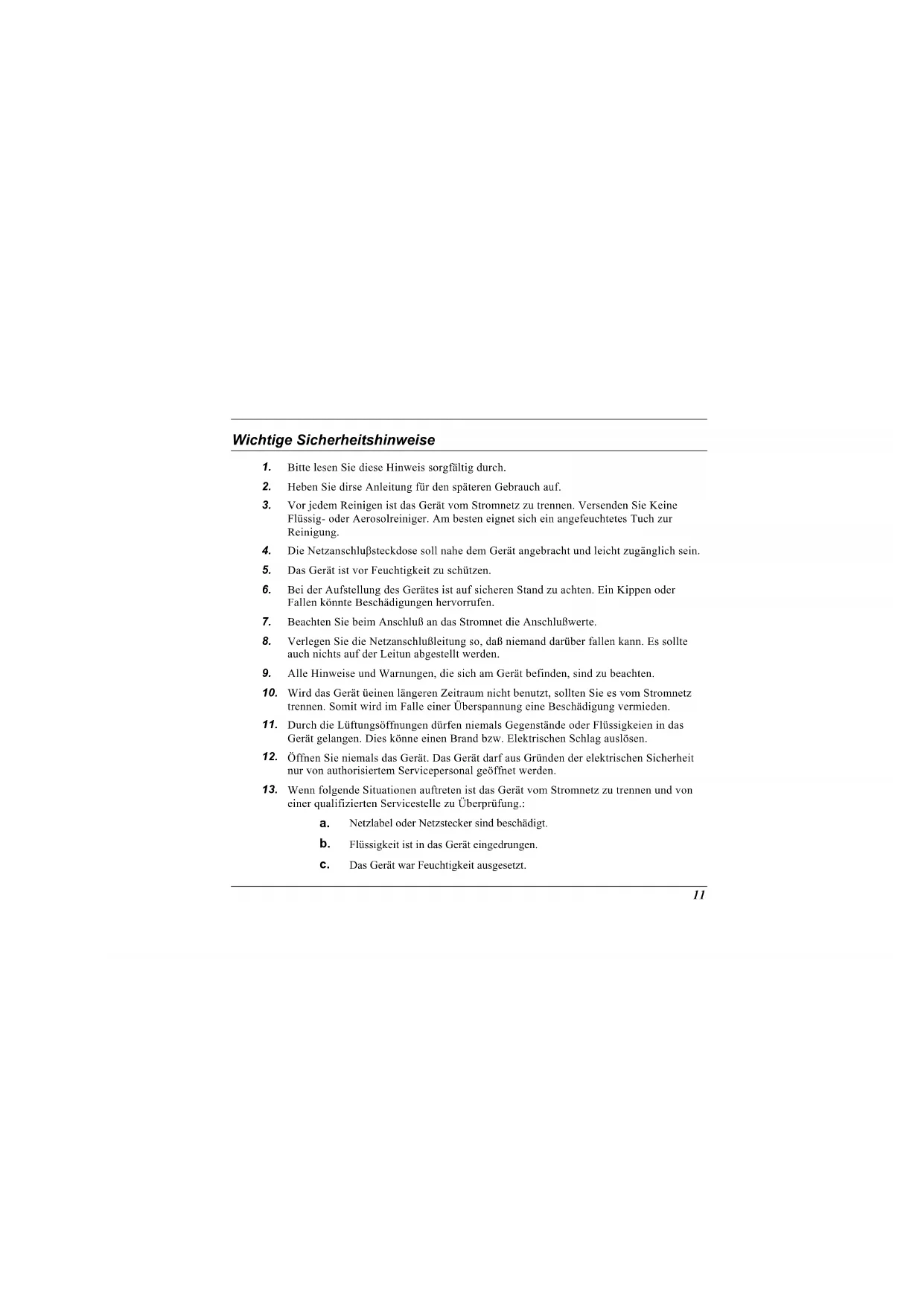 Bitte lesen Sie diese Hinweis sorgfältig durch. Heben Sie dirse Anleitung für den späteren Gebrauch auf. Vor jedem Reinigen ist das Gerät vom Stromnetz zu trennen. Versenden Sie Keine Flüssig- oder Aerosolreiniger. Am besten eignet sich ein angefeuchtetes Tuch zur Reinigung. Die Netzanschluβsteckdose soll nahe dem Gerät angebracht und leicht zugänglich sein. Das Gerät ist vor Feuchtigkeit zu schützen. Bei der Aufstellung des Gerätes ist auf sicheren Stand zu achten. Ein Kippen oder Fallen könnte Beschädigungen hervorrufen. Beachten Sie beim Anschluß an das Stromnet die Anschlußwerte. Verlegen Sie die Netzanschlußleitung so, daß niemand darüber fallen kann. Es sollte auch nichts auf der Leitun abgestellt werden. Alle Hinweise und Warnungen, die sich am Gerät befinden, sind zu beachten. Wird das Gerät üeinen längeren Zeitraum nicht benutzt, sollten Sie es vom Stromnetz trennen. Somit wird im Falle einer Überspannung eine Beschädigung vermieden. Durch die Lüftungsöffnungen dürfen niemals Gegenstände oder Flüssigkeien in das Gerät gelangen. Dies könne einen Brand bzw. Elektrischen Schlag auslösen. Öffnen Sie niemals das Gerät. Das Gerät darf aus Gründen der elektrischen Sicherheit nur von authorisiertem Servicepersonal geöffnet werden. Wenn folgende Situationen auftreten ist das Gerät vom Stromnetz zu trennen und von einer qualifizierten Servicestelle zu Überprüfung.: Netzlabel oder Netzstecker sind beschädigt. Flüssigkeit ist in das Gerät eingedrungen. Das Gerät war Feuchtigkeit ausgesetzt. 11d.