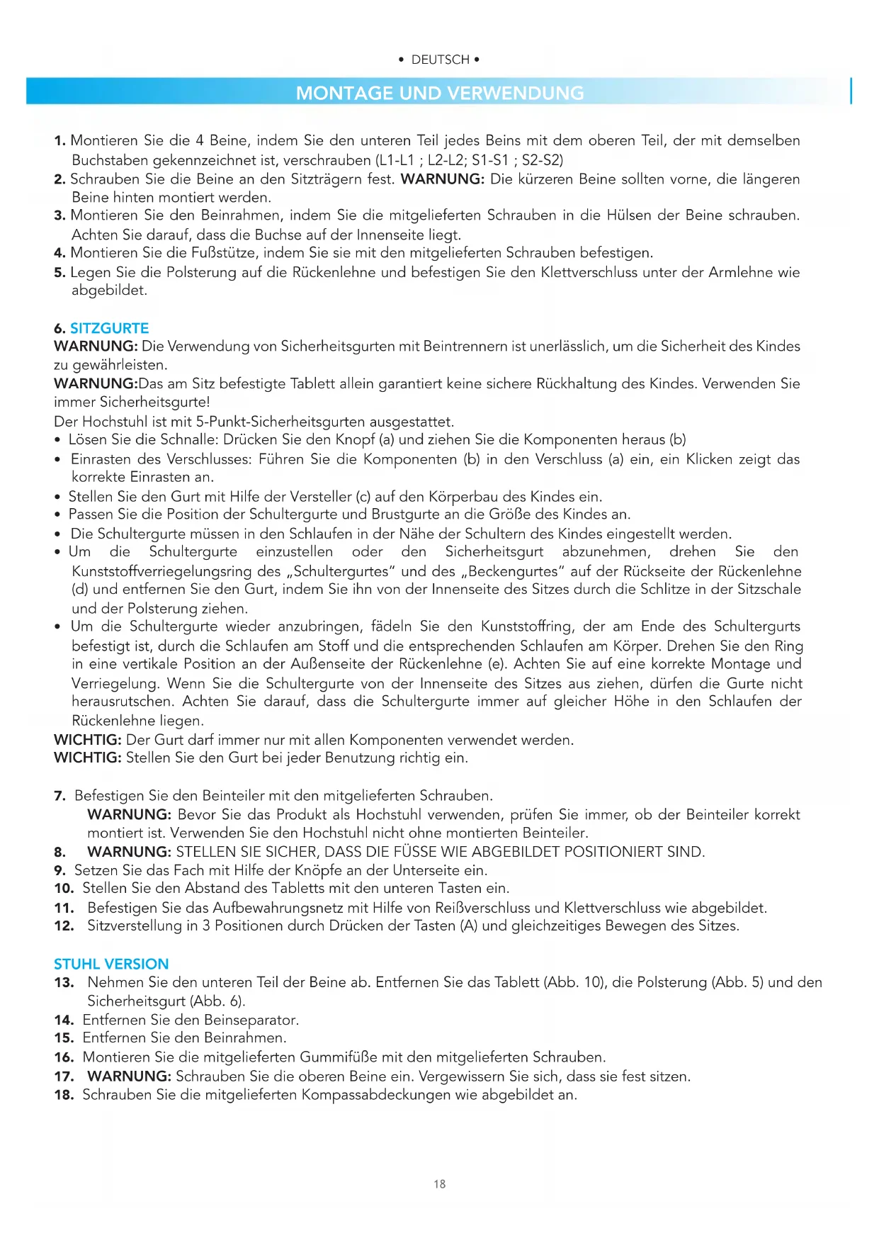 WARNUNG: Die Verwendung von Sicherheitsgurten mit Beintrennern ist unerlässlich, um die Sicherheit des Kindes zu gewährleisten. WARNUNG:Das am Sitz befestigte Tablett allein garantiert keine sichere Rückhaltung des Kindes. Verwenden Sie immer Sicherheitsgurte! Der Hochstuhl ist mit 5-Punkt-Sicherheitsgurten ausgestattet.