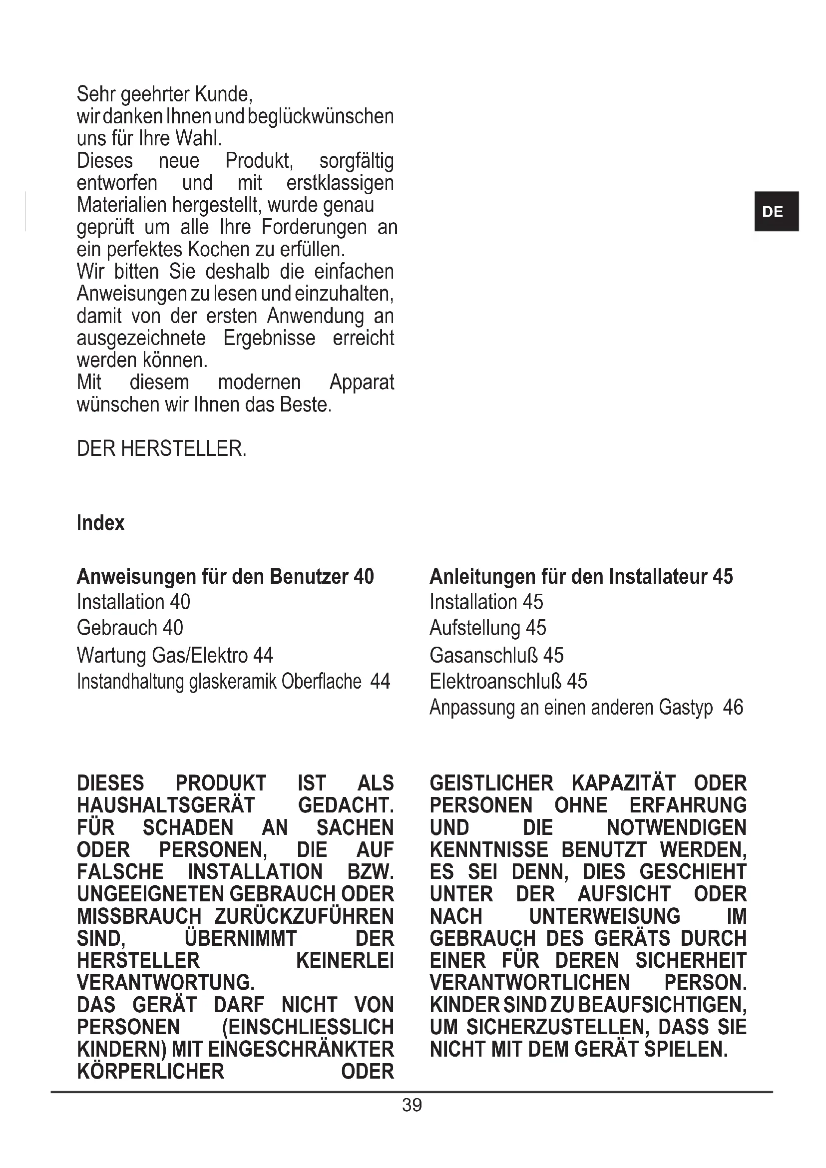 Sehr geehrter Kunde, wir danken Ihnen und beglückwünschen uns für Ihre Wahl. Dieses neue Produkt, sorgfältig entworfen und mit erstklassigen Materialien hergestellt, wurde genau geprüft um alle Ihre Forderungen an ein perfektes Kochen zu erfüllen. Wir bitten Sie deshalb die einfachen Anweisungen zu lesen und einzuhalten, damit von der ersten Anwendung an ausgezeichnete Ergebnisse erreicht werden können. Mit diesem modernen Apparat wünschen wir Ihnen das Beste. DER HERSTELLER. Index Anweisungen für den Benutzer 40 Installation 40 Gebrauch 40 Wartung Gas/Elektro 44 Instandhaltung glaskeramik Oberache