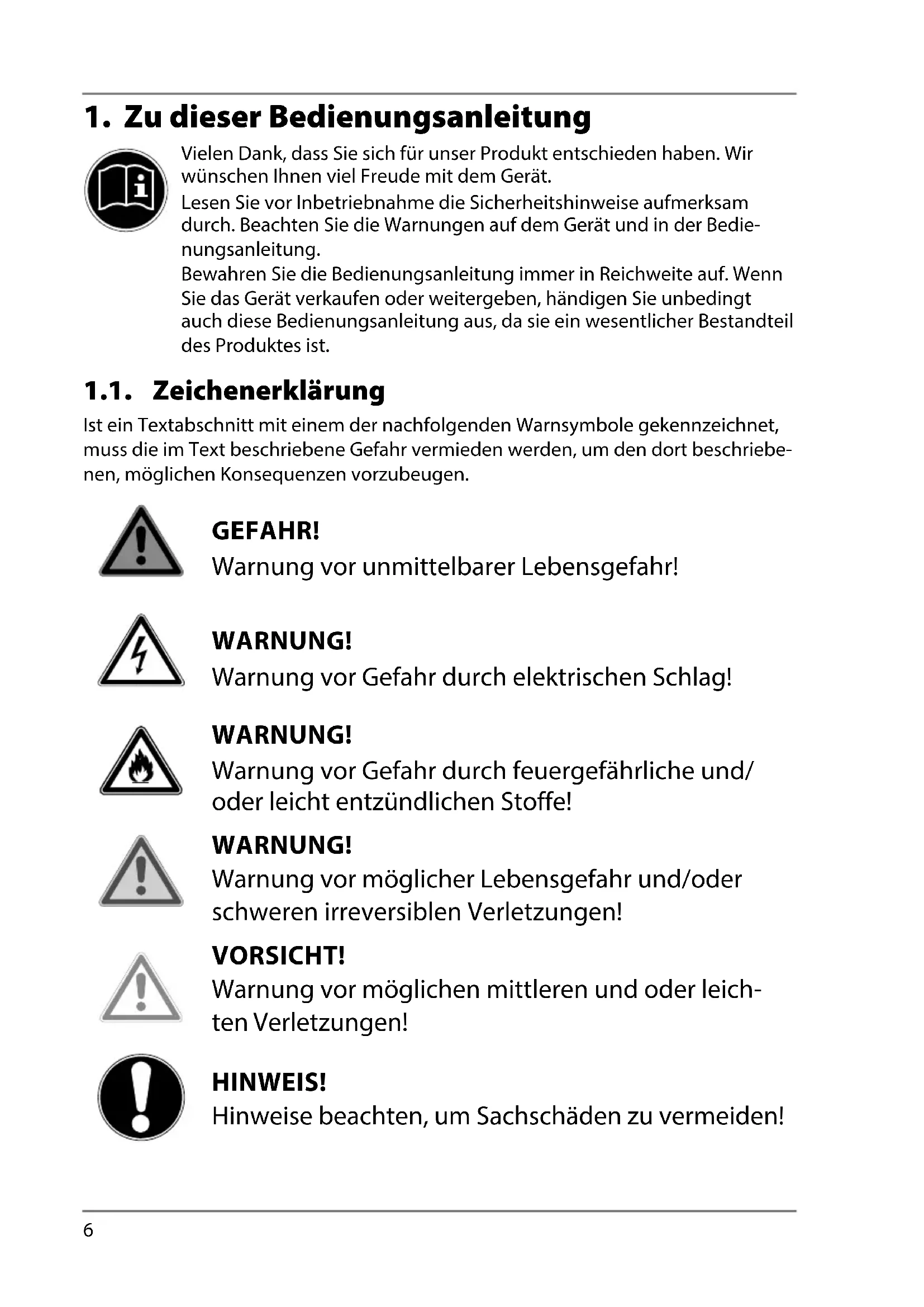 Vielen Dank, dass Sie sich für unser Produkt entschieden haben. Wir wünschen Ihnen viel Freude mit dem Gerät. Lesen Sie vor Inbetriebnahme die Sicherheitshinweise aufmerksam durch. Beachten Sie die Warnungen auf dem Gerät und in der Bedie- nungsanleitung. Bewahren Sie die Bedienungsanleitung immer in Reichweite auf. Wenn Sie das Gerät verkaufen oder weitergeben, händigen Sie unbedingt auch diese Bedienungsanleitung aus, da sie ein wesentlicher Bestandteil des Produktes ist. 1.1. Zeichenerklärung Ist ein Textabschnitt mit einem der nachfolgenden Warnsymbole gekennzeichnet, muss die im Text beschriebene Gefahr vermieden werden, um den dort beschriebe- nen, möglichen Konsequenzen vorzubeugen. GEFAHR! Warnung vor unmittelbarer Lebensgefahr! WARNUNG! Warnung vor Gefahr durch elektrischen Schlag! WARNUNG! Warnung vor Gefahr durch feuergefährliche und/ oder leicht entzündlichen Stoffe! WARNUNG! Warnung vor möglicher Lebensgefahr und/oder schweren irreversiblen Verletzungen! VORSICHT! Warnung vor möglichen mittleren und oder leich- ten Verletzungen! HINWEIS! Hinweise beachten, um Sachschäden zu vermeiden!7