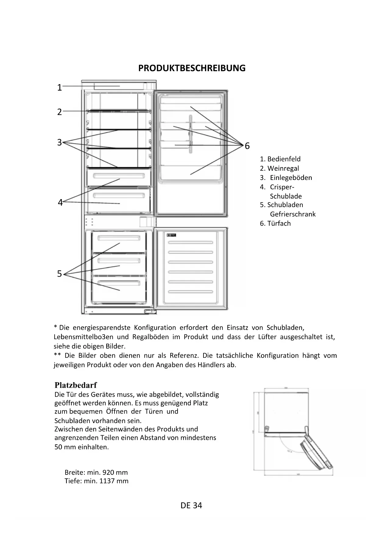 - Die energiesparendste Konfiguration erfordert den Einsatz von Schubladen,Lebensmittelbo3en und Regalböden im Produkt und dass der Lüfter ausgeschaltet ist,siehe die obigen Bilder.** Die Bilder oben dienen nur als Referenz. Die tatsächliche Konfiguration hängt vomjeweiligen Produkt oder von den Angaben des Händlers ab.Platzbedarf Die Tür des Gerätes muss, wie abgebildet, vollständig geöffnet werden können. Es muss genügend Platz zum bequemen Öffnen der Türen und Schubladen vorhanden sein. Zwischen den Seitenwänden des Produkts und angrenzenden Teilen einen Abstand von mindestens 50 mm einhalten.Breite: min. 920 mm Tiefe: min. 1137 mm1. Bedienfeld2. Weinregal
