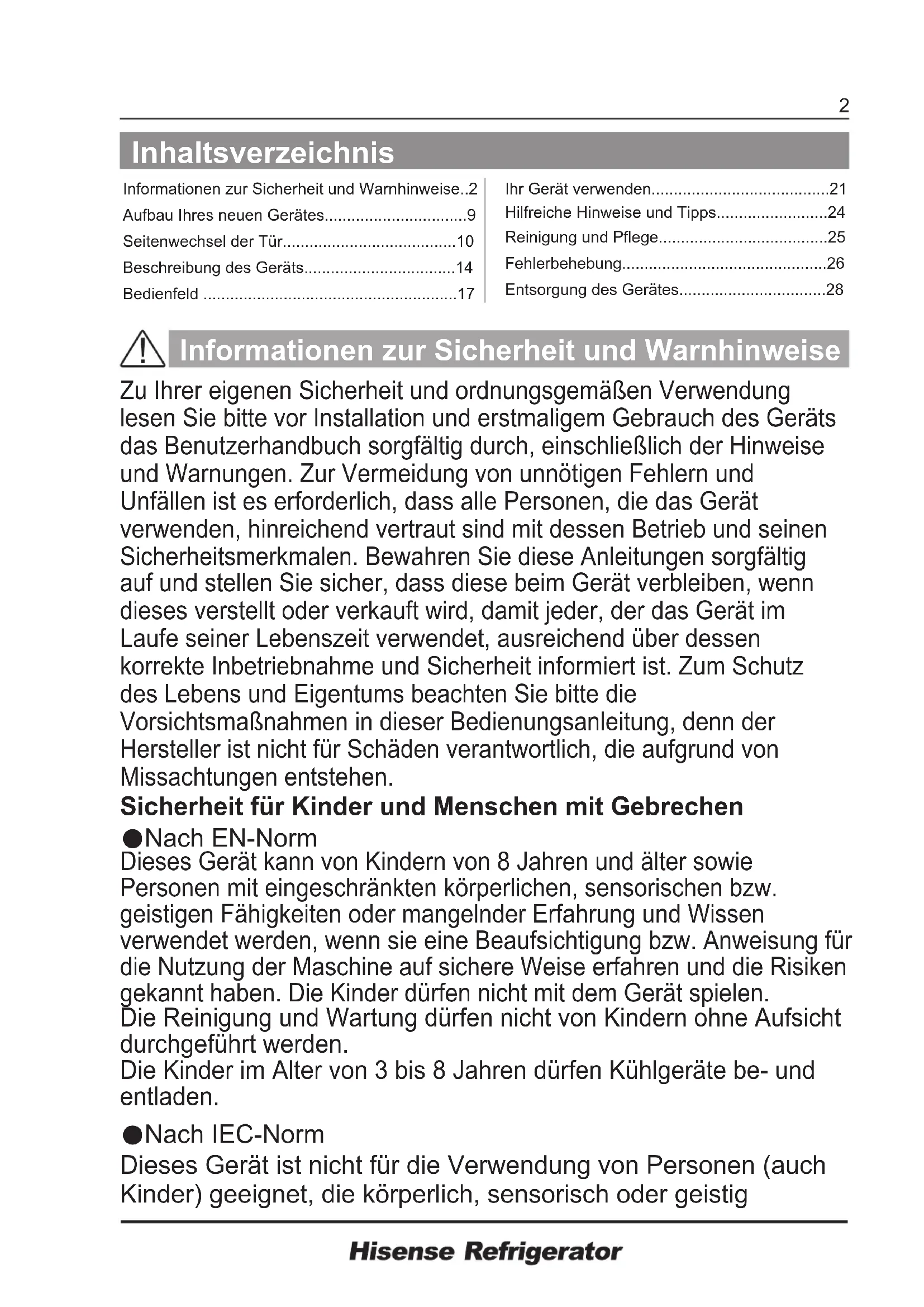 Nach EN-Norm Dieses Gerät kann von Kindern von 8 Jahren und älter sowie Personen mit eingeschränkten körperlichen, sensorischen bzw. geistigen Fähigkeiten oder mangelnder Erfahrung und Wissen verwendet werden, wenn sie eine Beaufsichtigung bzw. Anweisung für die Nutzung der Maschine auf sichere Weise erfahren und die Risiken gekannt haben. Die Kinder dürfen nicht mit dem Gerät spielen. Die Reinigung und Wartung dürfen nicht von Kindern ohne Aufsicht durchgeführt werden. Die Kinder im Alter von 3 bis 8 Jahren dürfen Kühlgeräte be- und entladen. Nach IEC-Norm Dieses Gerät ist nicht für die Verwendung von Personen (auch Kinder) geeignet, die körperlich, sensorisch oder geistig