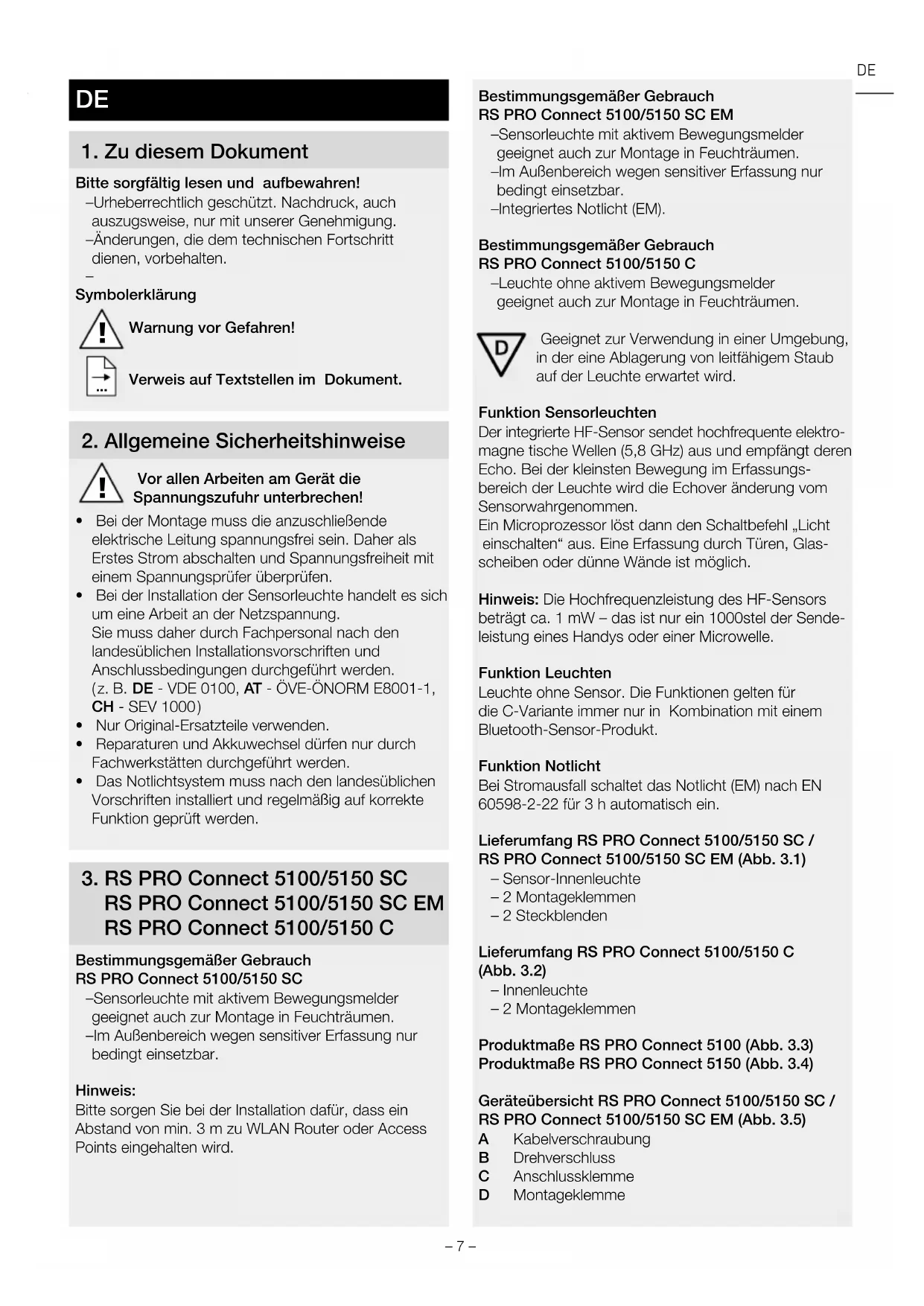 RS PRO Connect 5100/5150 SC EM RS PRO Connect 5100/5150 C Bestimmungsgemäßer Gebrauch RS PRO Connect 5100/5150 SC – Sensorleuchte mit aktivem Bewegungsmelder geeignet auch zur Montage in Feuchträumen. – Im Außenbereich wegen sensitiver Erfassung nur bedingt einsetzbar. Hinweis: Bitte sorgen Sie bei der Installation dafür, dass ein Abstand von min. 3 m zu WLAN Router oder Access Points eingehalten wird. Bestimmungsgemäßer Gebrauch RS PRO Connect 5100/5150 SC EM – Sensorleuchte mit aktivem Bewegungsmelder geeignet auch zur Montage in Feuchträumen. – Im Außenbereich wegen sensitiver Erfassung nur bedingt einsetzbar. – Integriertes Notlicht (EM). Bestimmungsgemäßer Gebrauch RS PRO Connect 5100/5150 C – Leuchte ohne aktivem Bewegungsmelder geeignet auch zur Montage in Feuchträumen. Geeignet zur Verwendung in einer Umgebung, in der eine Ablagerung von leitfähigem Staub auf der Leuchte erwartet wird. Funktion Sensorleuchten Der integrierte HF-Sensor sendet hochfrequente elektro- magne tische Wellen (5,8 GHz) aus und empfängt deren Echo. Bei der kleinsten Bewegung im Erfassungs- bereich der Leuchte wird die Echover änderung vom Sensor wahrgenommen. Ein Microprozessor löst dann den Schaltbefehl „Licht einschalten“ aus. Eine Erfassung durch Türen, Glas- scheiben oder dünne Wände ist möglich. Hinweis: Die Hochfrequenzleistung des HF-Sensors beträgt ca.1mW – das ist nur ein 1000stel der Sende- leistung eines Handys oder einer Microwelle. Funktion Leuchten Leuchte ohne Sensor. Die Funktionen gelten für die C-Variante immer nur in Kombination mit einem Bluetooth-Sensor-Produkt. Funktion Notlicht Bei Stromausfall schaltet das Notlicht (EM) nach EN 60598-2-22 für 3h automatisch ein. Lieferumfang RS PRO Connect 5100/5150 SC / RS PRO Connect 5100/5150 SC EM (Abb. 3.1) – Sensor-Innenleuchte – 2 Montageklemmen – 2 Steckblenden Lieferumfang RS PRO Connect 5100/5150 C (Abb. 3.2) – Innenleuchte – 2 Montageklemmen Produktmaße RS PRO Connect 5100 (Abb. 3.3) Produktmaße RS PRO Connect 5150 (Abb. 3.4) Geräteübersicht RS PRO Connect 5100/5150 SC / RS PRO Connect 5100/5150 SC EM (Abb. 3.5) A Kabelverschraubung B Drehverschluss C Anschlussklemme D Montageklemme – 7 – DEE Endkappen F Leuchtengehäuse G HF-Sensor H Steckblende Geräteübersicht RS PRO Connect 5100/5150 C (Abb. 3.6) A Kabelverschraubung B Drehverschluss C Anschlussklemme D Montageklemme E Endkappen F Leuchtengehäuse Erfassungsbereiche Deckenmontage Ø 1-10m (Abb. 3.7) Erfassungsbereich Wandmontage Ø 1-10m (Abb. 3.8) Lichtstärkeverteilung (Abb. 3.9 - 3.14)