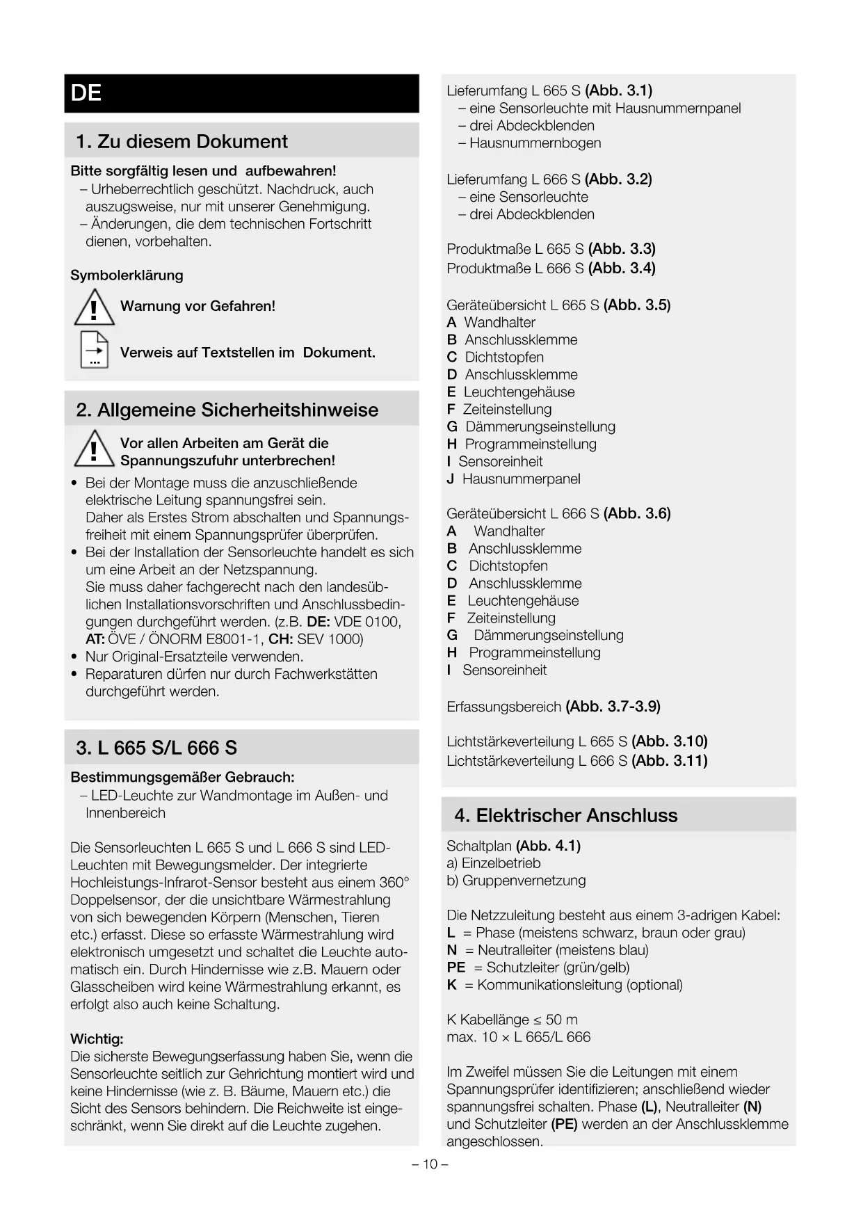 Bestimmungsgemäßer Gebrauch: – LED-Leuchte zur Wandmontage im Außen- und Innenbereich Die Sensorleuchten L 665 S und L 666 S sind LED- Leuchten mit Bewegungsmelder. Der integrierte Hochleistungs-Infrarot-Sensor besteht aus einem 360° Doppelsensor, der die unsichtbare Wärmestrahlung von sich bewegenden Körpern (Menschen, Tieren etc.) erfasst. Diese so erfasste Wärmestrahlung wird elektronisch umgesetzt und schaltet die Leuchte auto- matisch ein. Durch Hindernisse wie z.B. Mauern oder Glasscheiben wird keine Wärmestrahlung erkannt, es erfolgt also auch keine Schaltung. Wichtig: Die sicherste Bewegungserfassung haben Sie, wenn die Sensorleuchte seitlich zur Gehrichtung montiert wird und keine Hindernisse (wie z. B. Bäume, Mauern etc.) die Sicht des Sensors behindern. Die Reichweite ist einge- schränkt, wenn Sie direkt auf die Leuchte zugehen. Lieferumfang L 665 S (Abb. 3.1) – eine Sensorleuchte mit Hausnummernpanel – drei Abdeckblenden – Hausnummernbogen Lieferumfang L 666 S (Abb. 3.2) – eine Sensorleuchte – drei Abdeckblenden Produktmaße L 665 S (Abb. 3.3) Produktmaße L 666 S (Abb. 3.4) Geräteübersicht L 665 S (Abb. 3.5) A Wandhalter B Anschlussklemme C Dichtstopfen D Anschlussklemme E Leuchtengehäuse F Zeiteinstellung G Dämmerungseinstellung H Programmeinstellung I Sensoreinheit J Hausnummerpanel Geräteübersicht L 666 S (Abb. 3.6) A Wandhalter B Anschlussklemme C Dichtstopfen D Anschlussklemme E Leuchtengehäuse F Zeiteinstellung G Dämmerungseinstellung H Programmeinstellung I Sensoreinheit Erfassungsbereich (Abb. 3.7-3.9) Lichtstärkeverteilung L 665 S (Abb. 3.10) Lichtstärkeverteilung L 666 S (Abb. 3.11)
