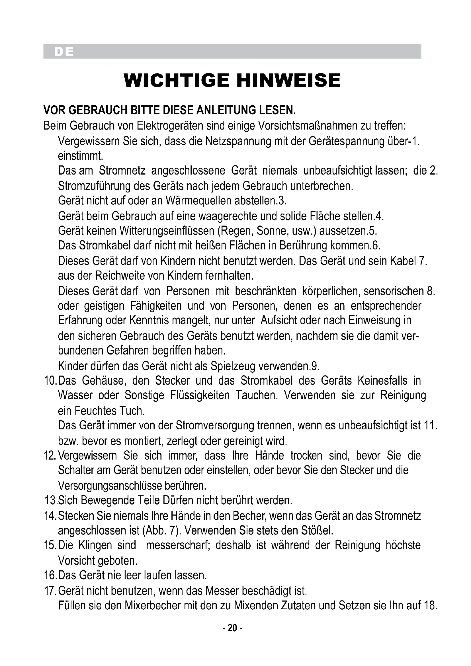 WICHTIGE HINWEISE VOR GEBRAUCH BITTE DIESE ANLEITUNG LESEN. Beim Gebrauch von Elektrogeräten sind einige Vorsichtsmaßnahmen zu treffen: Vergewissern Sie sich, dass die Netzspannung mit der Gerätespannung über-1. einstimmt. Das am Stromnetz angeschlossene Gerät niemals unbeaufsichtigt lassen; die 2. Stromzuführung des Geräts nach jedem Gebrauch unterbrechen. Gerät nicht auf oder an Wärmequellen abstellen.3. Gerät beim Gebrauch auf eine waagerechte und solide Fläche stellen.4. Gerät keinen Witterungseinflüssen (Regen, Sonne, usw.) aussetzen.5. Das Stromkabel darf nicht mit heißen Flächen in Berührung kommen.6. Dieses Gerät darf von Kindern nicht benutzt werden. Das Gerät und sein Kabel 7. aus der Reichweite von Kindern fernhalten. Dieses Gerät darf von Personen mit beschränkten körperlichen, sensorischen 8. oder geistigen Fähigkeiten und von Personen, denen es an entsprechender Erfahrung oder Kenntnis mangelt, nur unter Aufsicht oder nach Einweisung in den sicheren Gebrauch des Geräts benutzt werden, nachdem sie die damit ver- bundenen Gefahren begriffen haben. Kinder dürfen das Gerät nicht als Spielzeug verwenden.9. Das Gehäuse, den Stecker und das Stromkabel des Geräts Keinesfalls in 10. Wasser oder Sonstige Flüssigkeiten Tauchen. Verwenden sie zur Reinigung ein Feuchtes Tuch. Das Gerät immer von der Stromversorgung trennen, wenn es unbeaufsichtigt ist 11. bzw. bevor es montiert, zerlegt oder gereinigt wird. Vergewissern Sie sich immer, dass Ihre Hände trocken sind, bevor Sie die 12. Schalter am Gerät benutzen oder einstellen, oder bevor Sie den Stecker und die Versorgungsanschlüsse berühren. Sich Bewegende Teile Dürfen nicht berührt werden.13. Stecken Sie niemals Ihre Hände in den Becher, wenn das Gerät an das Stromnetz 14. angeschlossen ist (Abb. 7). Verwenden Sie stets den Stößel. Die Klingen sind messerscharf; deshalb ist während der Reinigung höchste 15. Vorsicht geboten. Das Gerät nie leer laufen lassen.16. Gerät nicht benutzen, wenn das Messer beschädigt ist.17. Füllen sie den Mixerbecher mit den zu Mixenden Zutaten und Setzen sie Ihn auf 18.DE