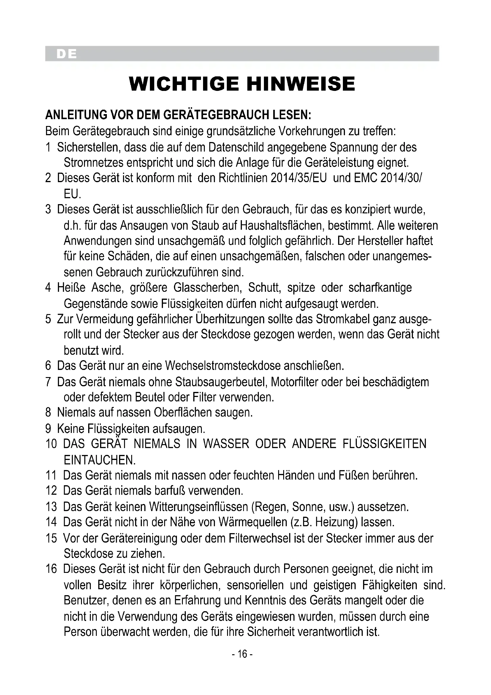 WICHTIGE HINWEISE ANLEITUNG VoR DEM GERÄTEGEBRAUCH LESEN: Beim Gerätegebrauch sind einige grundsätzliche Vorkehrungen zu treffen: 1 Sicherstellen, dass die auf dem Datenschild angegebene Spannung der des Stromnetzes entspricht und sich die Anlage für die Geräteleistung eignet. 2 Dieses Gerät ist konform mit den Richtlinien 2014/35/EU und EMC 2014/30/ EU. 3 Dieses Gerät ist ausschließlich für den Gebrauch, für das es konzipiert wurde, d.h. für das Ansaugen von Staub auf Haushaltsflächen, bestimmt. Alle weiteren Anwendungen sind unsachgemäß und folglich gefährlich. Der Hersteller haftet für keine Schäden, die auf einen unsachgemäßen, falschen oder unangemes- senen Gebrauch zurückzuführen sind. 4 Heiße Asche, größere Glasscherben, Schutt, spitze oder scharfkantige Gegenstände sowie Flüssigkeiten dürfen nicht aufgesaugt werden. 5 Zur Vermeidung gefährlicher Überhitzungen sollte das Stromkabel ganz ausge- rollt und der Stecker aus der Steckdose gezogen werden, wenn das Gerät nicht benutzt wird. 6 Das Gerät nur an eine Wechselstromsteckdose anschließen. 7 Das Gerät niemals ohne Staubsaugerbeutel, Motorfilter oder bei beschädigtem oder defektem Beutel oder Filter verwenden. 8 Niemals auf nassen Oberflächen saugen. 9 Keine Flüssigkeiten aufsaugen. 10 DAS GERÄT NIEMALS IN WASSER ODER ANDERE FLÜSSIGKEITEN EINTAUCHEN. 11 Das Gerät niemals mit nassen oder feuchten Händen und Füßen berühren. 12 Das Gerät niemals barfuß verwenden. 13 Das Gerät keinen Witterungseinflüssen (Regen, Sonne, usw.) aussetzen. 14 Das Gerät nicht in der Nähe von Wärmequellen (z.B. Heizung) lassen. 15 Vor der Gerätereinigung oder dem Filterwechsel ist der Stecker immer aus der Steckdose zu ziehen. 16 Dieses Gerät ist nicht für den Gebrauch durch Personen geeignet, die nicht im vollen Besitz ihrer körperlichen, sensoriellen und geistigen Fähigkeiten sind. Benutzer, denen es an Erfahrung und Kenntnis des Geräts mangelt oder die nicht in die Verwendung des Geräts eingewiesen wurden, müssen durch eine Person überwacht werden, die für ihre Sicherheit verantwortlich ist.DE