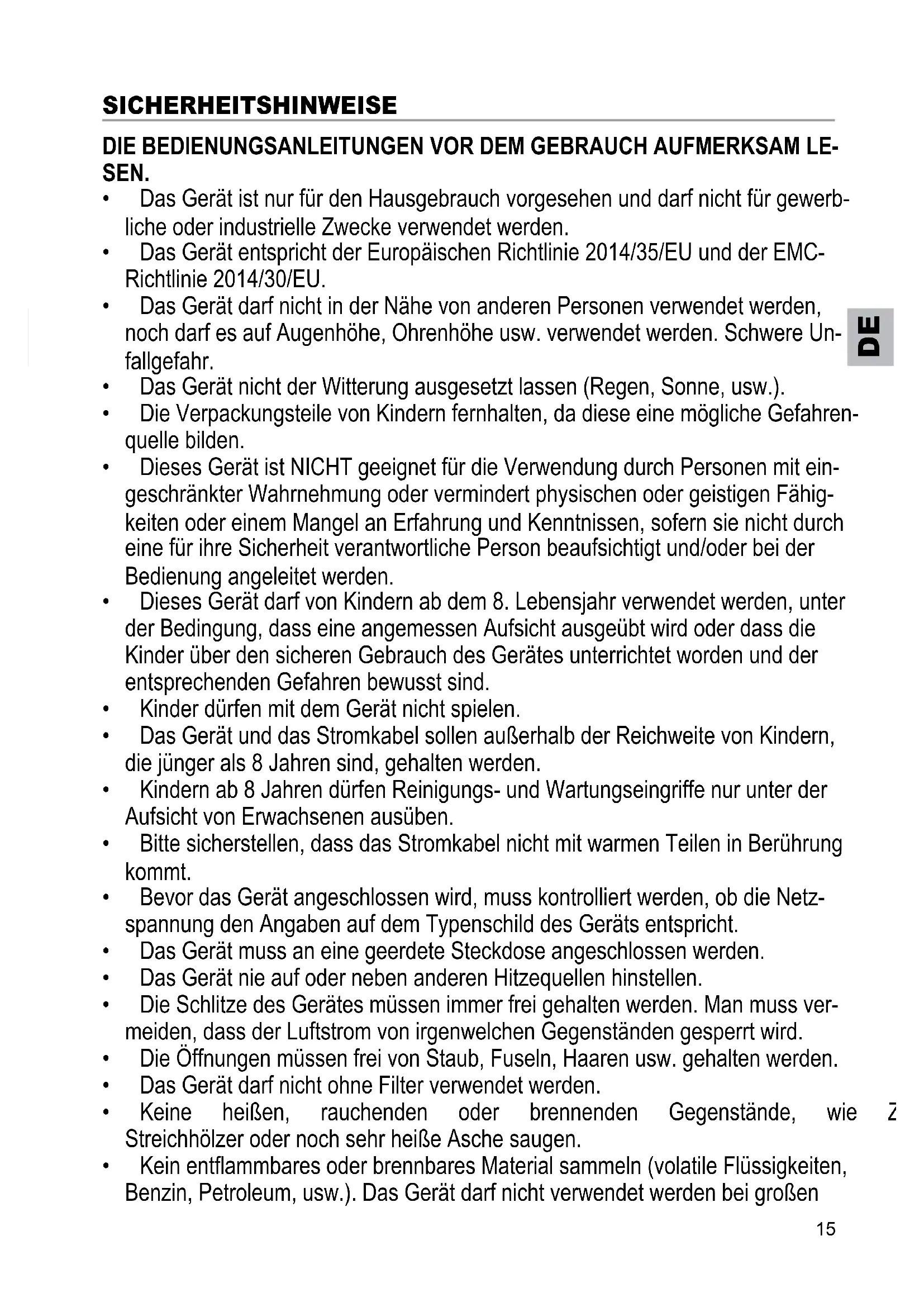 - Keine heißen, rauchenden oder brennenden Gegenstände, wie Zigaretten, StreichhölzerodernochsehrheißeAschesaugen.