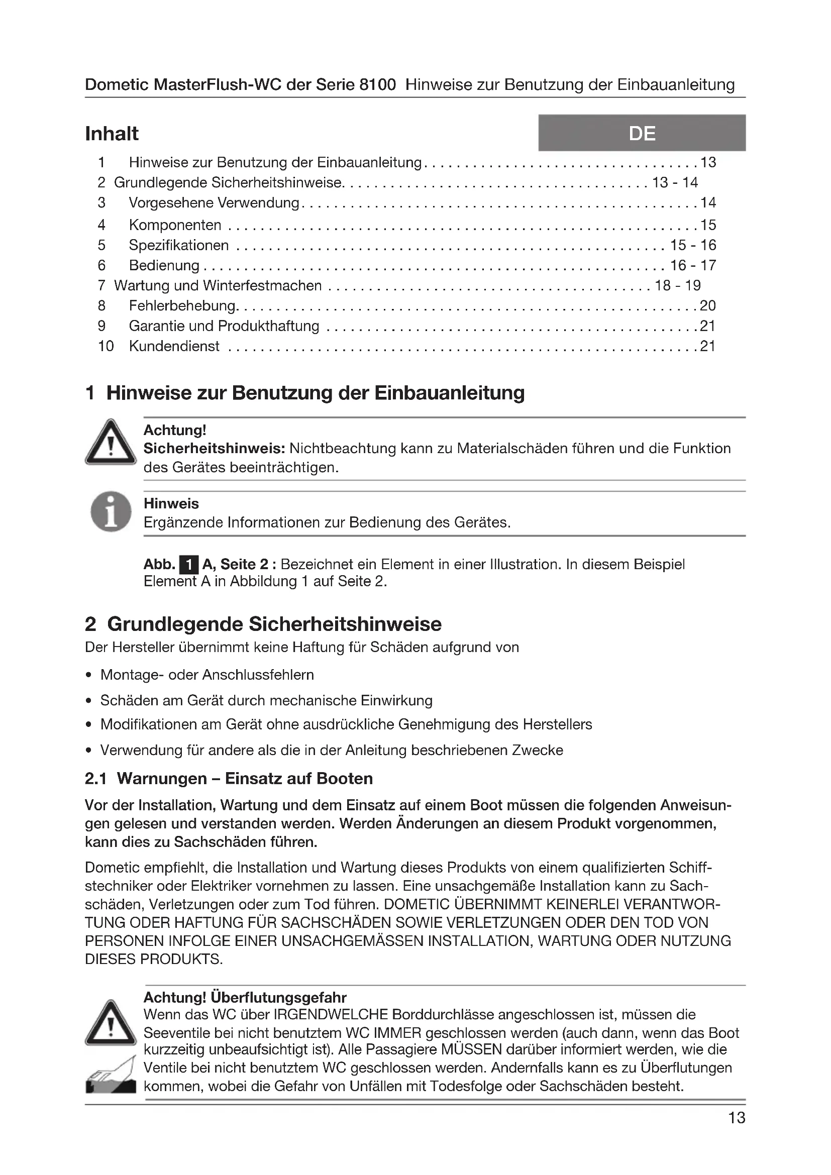 - Vor der Installation, Wartung und dem Einsatz auf einem Boot müssen die folgenden Anweisun- gen gelesen und verstanden werden. Werden Änderungen an diesem Produkt vorgenommen, kann dies zu Sachschäden führen. Dometic empehlt, die Installation und Wartung dieses Produkts von einem qualizierten Schiff- stechniker oder Elektriker vornehmen zu lassen. Eine unsachgemäße Installation kann zu Sach- schäden, Verletzungen oder zum Tod führen. DOMETIC ÜBERNIMMT KEINERLEI VERANTWOR- TUNG ODER HAFTUNG FÜR SACHSCHÄDEN SOWIE VERLETZUNGEN ODER DEN TOD VON PERSONEN INFOLGE EINER UNSACHGEMÄSSEN INSTALLATION, WARTUNG ODER NUTZUNG DIESES PRODUKTS. 1 Hinweise zur Benutzung der Einbauanleitung p. 13