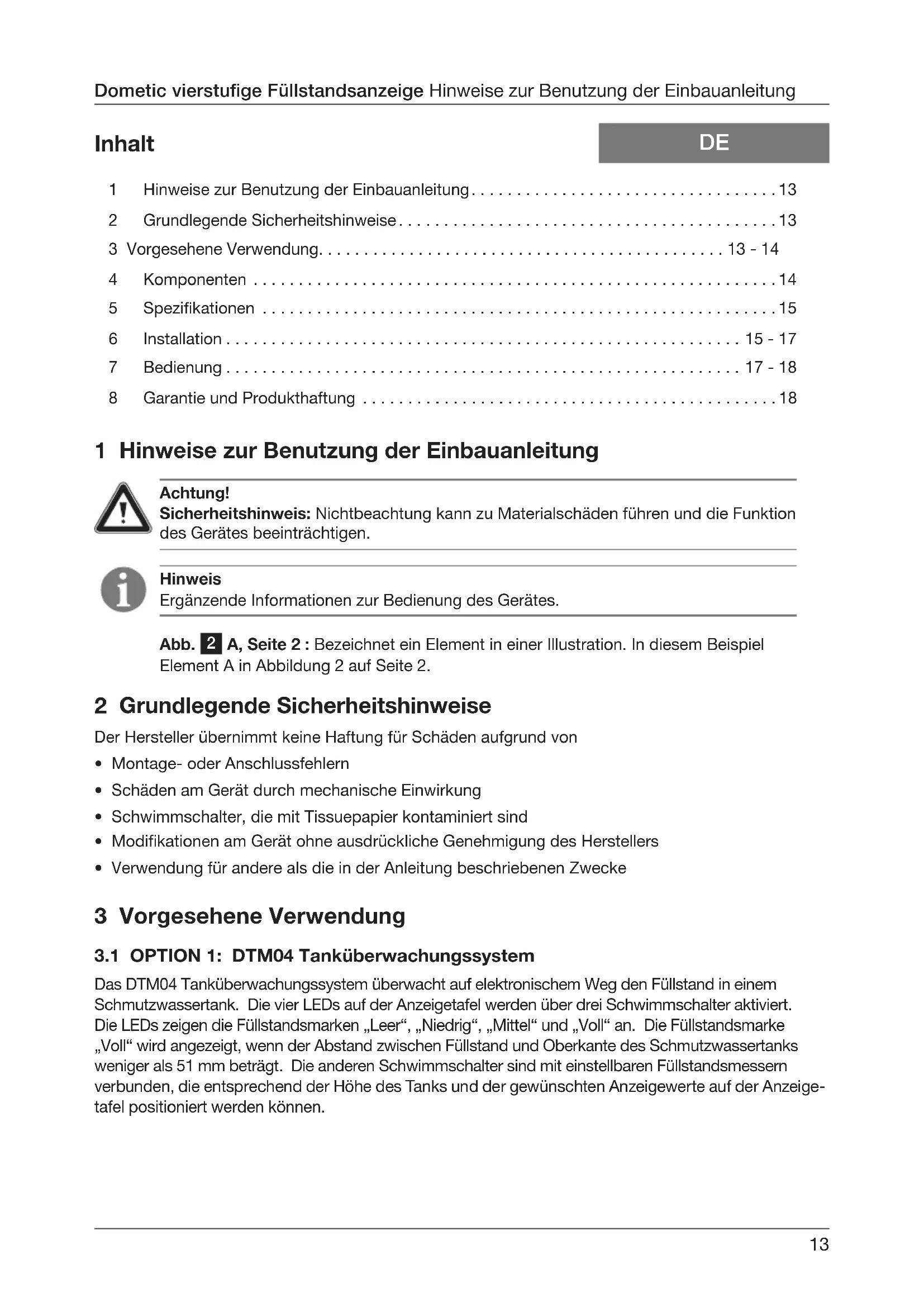 Inhalt Dometic vierstufige Füllstandsanzeige Hinweise zur Benutzung der Einbauanleitung 3 Vorgesehene Verwendung
