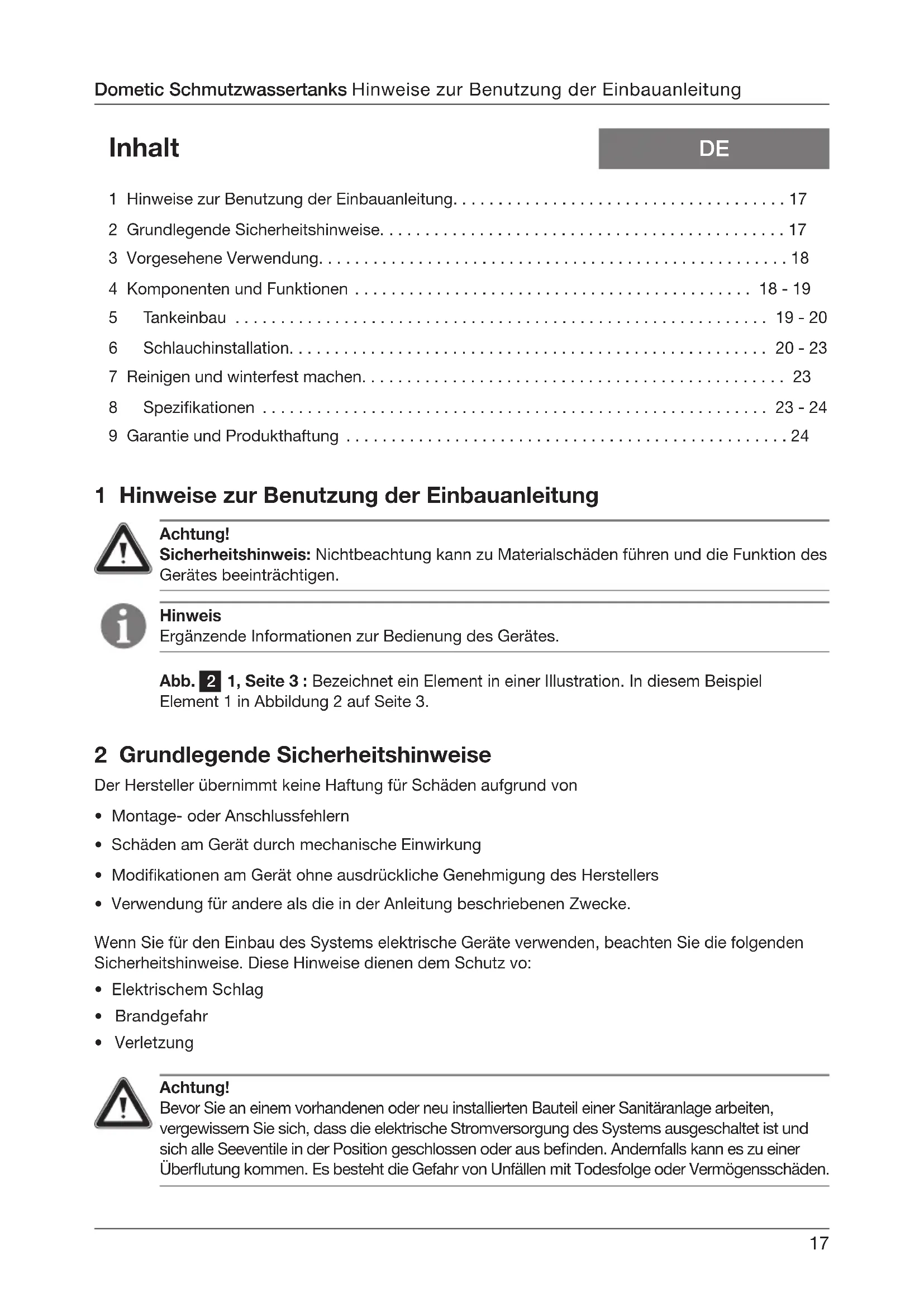 - - 24 9 Garantie und Produkthaftung 1 Hinweise zur Benutzung der Einbauanleitung Hinweis Ergänzende Informationen zur Bedienung des Gerätes. Abb. 1, Seite 3 : Bezeichnet ein Element in einer Illustration. In diesem Beispiel Element 1 in Abbildung 2 auf Seite 3. p. 24