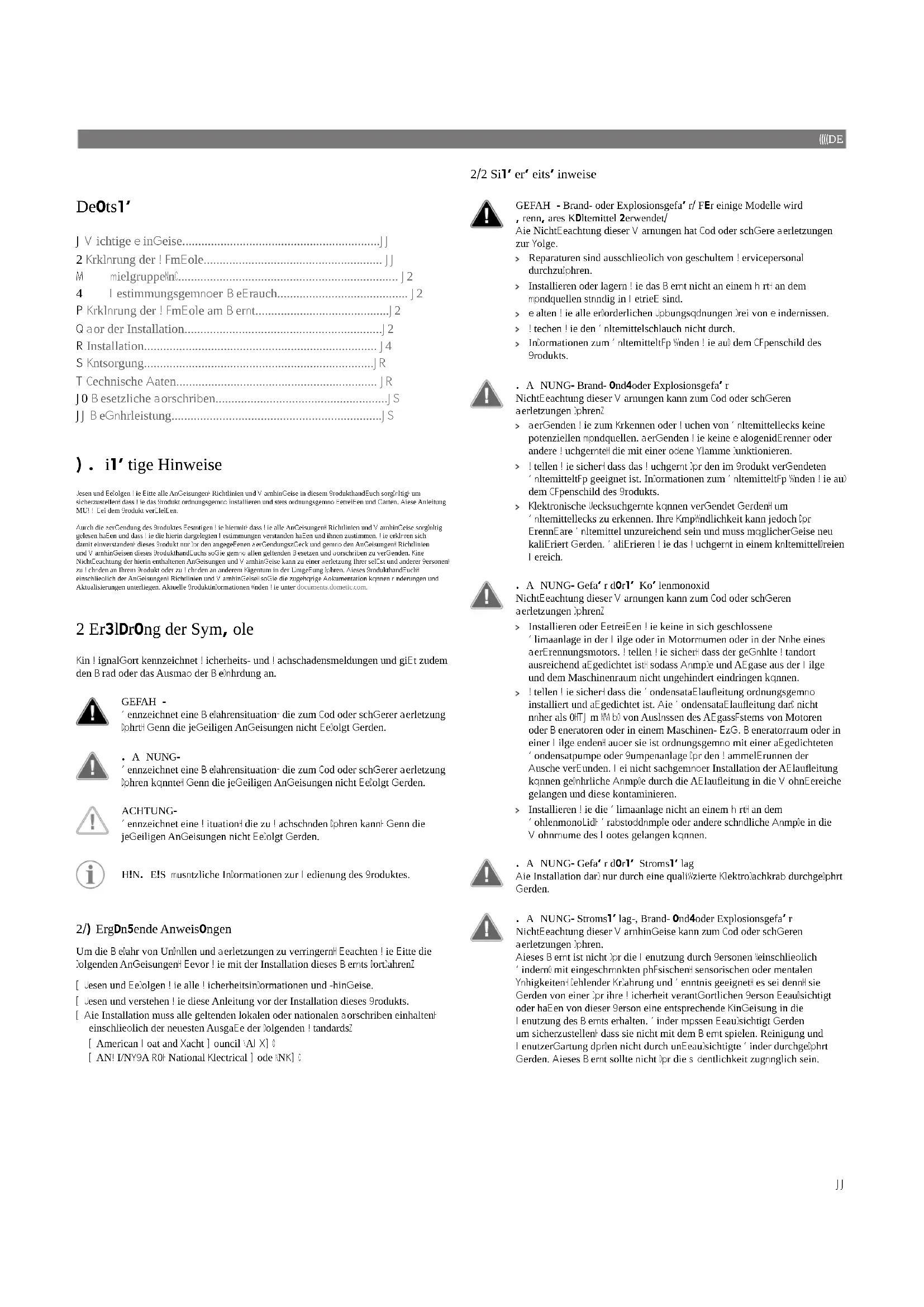 - A reason for the claim or description of the fault Note that self-repair or nonprofessional repair can have safety consequences and might void the warranty. 10DE Deutsch 1 Wichtige Hinweise..............................................................11 2 Erklärung der Symbole........................................................ 11 3 Zielgruppe(n)..................................................................... 12 4 Bestimmungsgemäßer Gebrauch......................................... 12 5 Erklärung der Symbole am Gerät..........................................12 6 Vor der Installation..............................................................12 7 Installation......................................................................... 14 8 Entsorgung........................................................................17 9 Technische Daten............................................................... 17 10 Gesetzliche Vorschrien......................................................18 11 Gewährleistung..................................................................18 1 Wichtige Hinweise Lesen und befolgen Sie bitte alle Anweisungen, Richtlinien und Warnhinweise in diesem Produkthandbuch sorgfältig, um sicherzustellen, dass Sie das Produkt ordnungsgemäß installieren und stets ordnungsgemäß betreiben und warten. Diese Anleitung MUSS bei dem Produkt verbleiben. Durch die Verwendung des Produktes bestätigen Sie hiermit, dass Sie alle Anweisungen, Richtlinien und Warnhinweise sorgfältig gelesen haben und dass Sie die hierin dargelegten Bestimmungen verstanden haben und ihnen zustimmen. Sie erklären sich damit einverstanden, dieses Produkt nur für den angegebenen Verwendungszweck und gemäß den Anweisungen, Richtlinien und Warnhinweisen dieses Produkthandbuchs sowie gemäß allen geltenden Gesetzen und Vorschrien zu verwenden. Eine Nichtbeachtung der hierin enthaltenen Anweisungen und Warnhinweise kann zu einer Verletzung Ihrer selbst und anderer Personen, zu Schäden an Ihrem Produkt oder zu Schäden an anderem Eigentum in der Umgebung führen. Dieses Produkthandbuch, einschließlich der Anweisungen, Richtlinien und Warnhinweise, sowie die zugehörige Dokumentation können Änderungen und Aktualisierungen unterliegen. Aktuelle Produktinformationen finden Sie unter documents.dometic.com. 2 Erklärung der Symbole Ein Signalwort kennzeichnet Sicherheits- und Sachschadensmeldungen und gibt zudem den Grad oder das Ausmaß der Gefährdung an. GEFAHR! Kennzeichnet eine Gefahrensituation, die zum Tod oder schwerer Verletzung führt, wenn die jeweiligen Anweisungen nicht befolgt werden. WARNUNG! Kennzeichnet eine Gefahrensituation, die zum Tod oder schwerer Verletzung führen könnte, wenn die jeweiligen Anweisungen nicht befolgt werden. ACHTUNG! Kennzeichnet eine Situation, die zu Sachschäden führen kann, wenn die jeweiligen Anweisungen nicht befolgt werden. HINWEIS Zusätzliche Informationen zur Bedienung des Produktes.