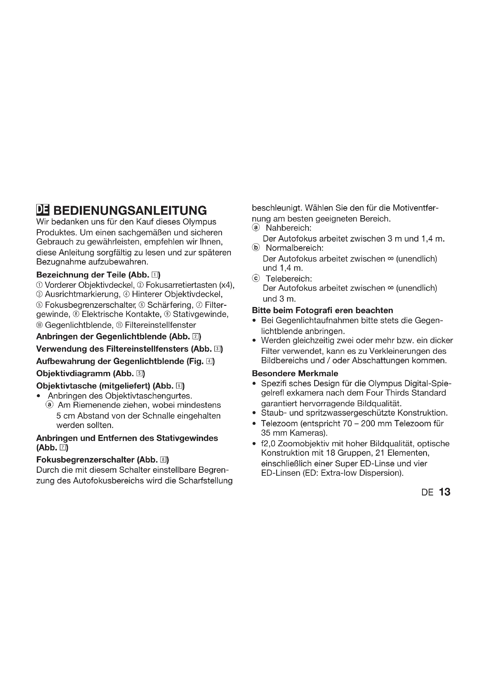 - DE 13 BEDIENUNGSANLEITUNG Wir bedanken uns für den Kauf dieses Olympus Produktes. Um einen sachgemäßen und sicheren Gebrauch zu gewährleisten, empfehlen wir Ihnen, diese Anleitung sorgfältig zu lesen und zur späteren Bezugnahme aufzubewahren. Bezeichnung der Teile (Abb. 1) 1 Vorderer Objektivdeckel, 2 Fokusarretiertasten (x4), 3 Ausrichtmarkierung, 4 Hinterer Objektivdeckel, 5 Fokusbegrenzerschalter, 6 Schärfering, 7 Filter- gewinde, 8 Elektrische Kontakte, 9 Stativgewinde, 0 Gegenlichtblende, q Filtereinstellfenster Anbringen der Gegenlichtblende (Abb. 2) Verwendung des Filtereinstellfensters (Abb. 3) Aufbewahrung der Gegenlichtblende (Fig. 4) Objektivdiagramm (Abb. 5) Objektivtasche (mitgeliefert) (Abb. 6) Anbringen des Objektivtaschengurtes.